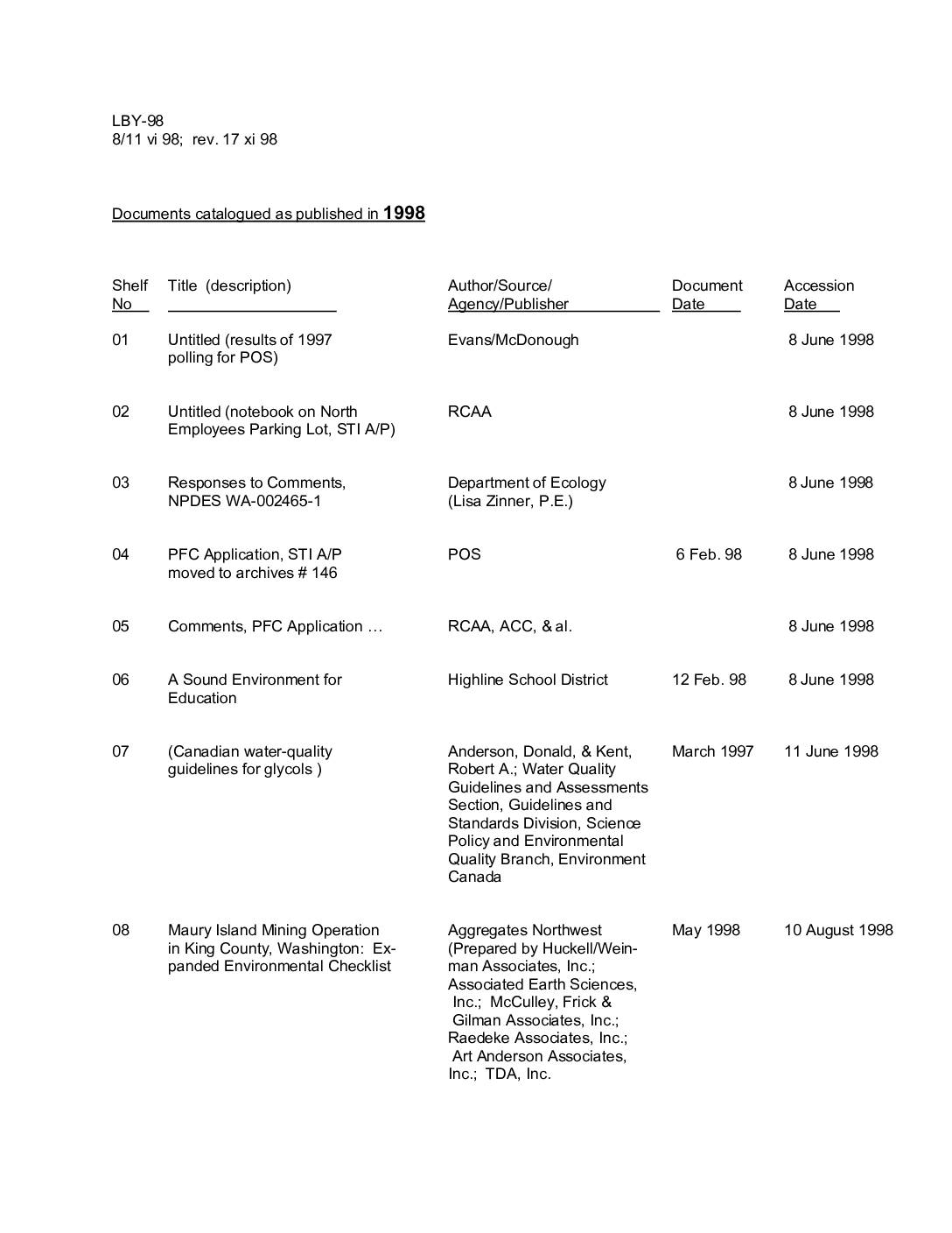 Untitled (results of 1997 Evans/McDonough 8 June 1998 polling for POS) Untitled (notebook on North RCAA 8 June 1998 Employees Parking Lot, STI A/P) Responses to Comments, Department of Ecology 8 June 1998 NPDES WA-002465-1 (Lisa Zinner, P.E.) PFC Application, STI A/P POS 6 Feb. 98 8 June 1998 moved to archives # 146 Comments, PFC Application … RCAA, ACC, & al. 8 June 1998 A Sound Environment for Highline School District 12 Feb. 98 8 June 1998 Education (Canadian water-quality Anderson, Donald, & Kent, March 1997 11 June 1998 guidelines for glycols ) Robert A.; Water Quality Guidelines and Assessments Section, Guidelines and Standards Division, Science Policy and Environmental Quality Branch, Environment Canada Maury Island Mining Operation Aggregates Northwest May 1998 10 August 1998 in King County, Washington: Ex- (Prepared by Huckell/Wein- panded Environmental Checklist man Associates, Inc.; Associated Earth Sciences, Inc.; McCulley, Frick & Gilman Associates, Inc.; Raedeke Associates, Inc.; Art Anderson Associates, Inc.; TDA, Inc. Documents catalogued as published in 1998 Page 2 Shelf Title (description) Author/Source/ Document Accession No Agency/Publisher Date Date Air traffic and operational data on Langley Research Center, May 1998 10 August 1998 selected U.S. airports with parallel National Aeronautics and runway: NASA/CR-1998-207675 Space Administration. Prepared for Langley Research Center and FAA, by Thomas M. Doyle, Adsytech, Inc., and Frank G. McGee, Lockheed Martin Engineering & Sciences Information resources in toxicology National Library of Medicine, n.d. 10 August 1998 and environmental health: National Institutes of Health [February (12 May 1998) A handbook for… -