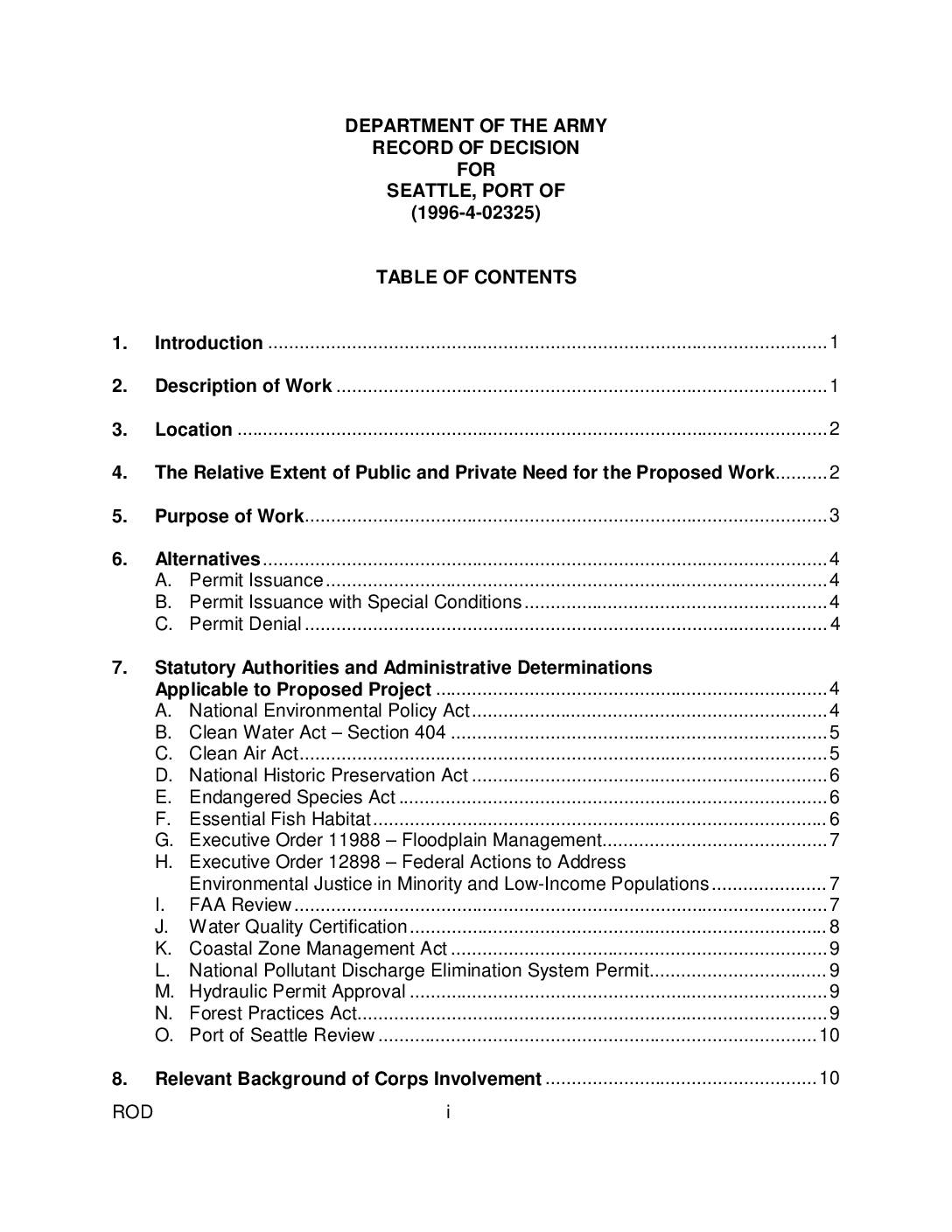 4. The Relative Extent of Public and Private Need for the Proposed Work..........2 5. Purpose of Work....................................................................................................3 6. Alternatives ............................................................................................................4 A. Permit Issuance................................................................................................4 B. Permit Issuance with Special Conditions..........................................................4 C. Permit Denial ....................................................................................................4 7. Statutory Authorities and Administrative Determinations Applicable to Proposed Project ...........................................................................4 A. National Environmental Policy Act ....................................................................4 B. Clean Water Act – Section 404 ........................................................................5 C. Clean Air Act.....................................................................................................5 D. National Historic Preservation Act ....................................................................6 E. Endangered Species Act ..................................................................................6 F. Essential Fish Habitat .......................................................................................6 G. Executive Order 11988 – Floodplain Management...........................................7 H. Executive Order 12898 – Federal Actions to Address Environmental Justice in Minority and Low-Income Populations ......................7 I. FAA Review......................................................................................................7 J. Water Quality Certification................................................................................8 K. Coastal Zone Management Act ........................................................................9 L. National Pollutant Discharge Elimination System Permit..................................9 M. Hydraulic Permit Approval ................................................................................9 N. Forest Practices Act..........................................................................................9 O. Port of Seattle Review ....................................................................................10 8. Relevant Background of Corps Involvement ....................................................10 ROD ii 9. Impact Evaluation................................................................................................11 A. Effect on Wetlands .........................................................................................12 B. Fish and Wildlife .............................................................................................17 C. Water Quality..................................................................................................18 D. Historic, Cultural, Scenic, and Recreational Values........................................29 E. Effects on Limits of the Territorial Seas..........................................................30 F. Consideration of Property Ownership.............................................................30 G. Activities Affecting Coastal Zones ..................................................................31 H. Activities in Marine Sanctuaries......................................................................31 I. Other Federal, State, or Local Requirements .................................................31 (1) Endangered Species ..............................................................................31 (2) Essential Fish Habitat .............................................................................36 (3) Environmental Justice.............................................................................37 J. Safety of Impoundment Structures .................................................................38 K. Floodplain Management .................................................................................38 L. Water Supply and Conservation.....................................................................39 M. Energy Conservation and Development .........................................................39 N. Navigation.......................................................................................................39 O. Environmental Benefits...................................................................................39 P. Economics ......................................................................................................39 Q. Mitigation ........................................................................................................41 R. Safety .............................................................................................................41 S. Cumulative…