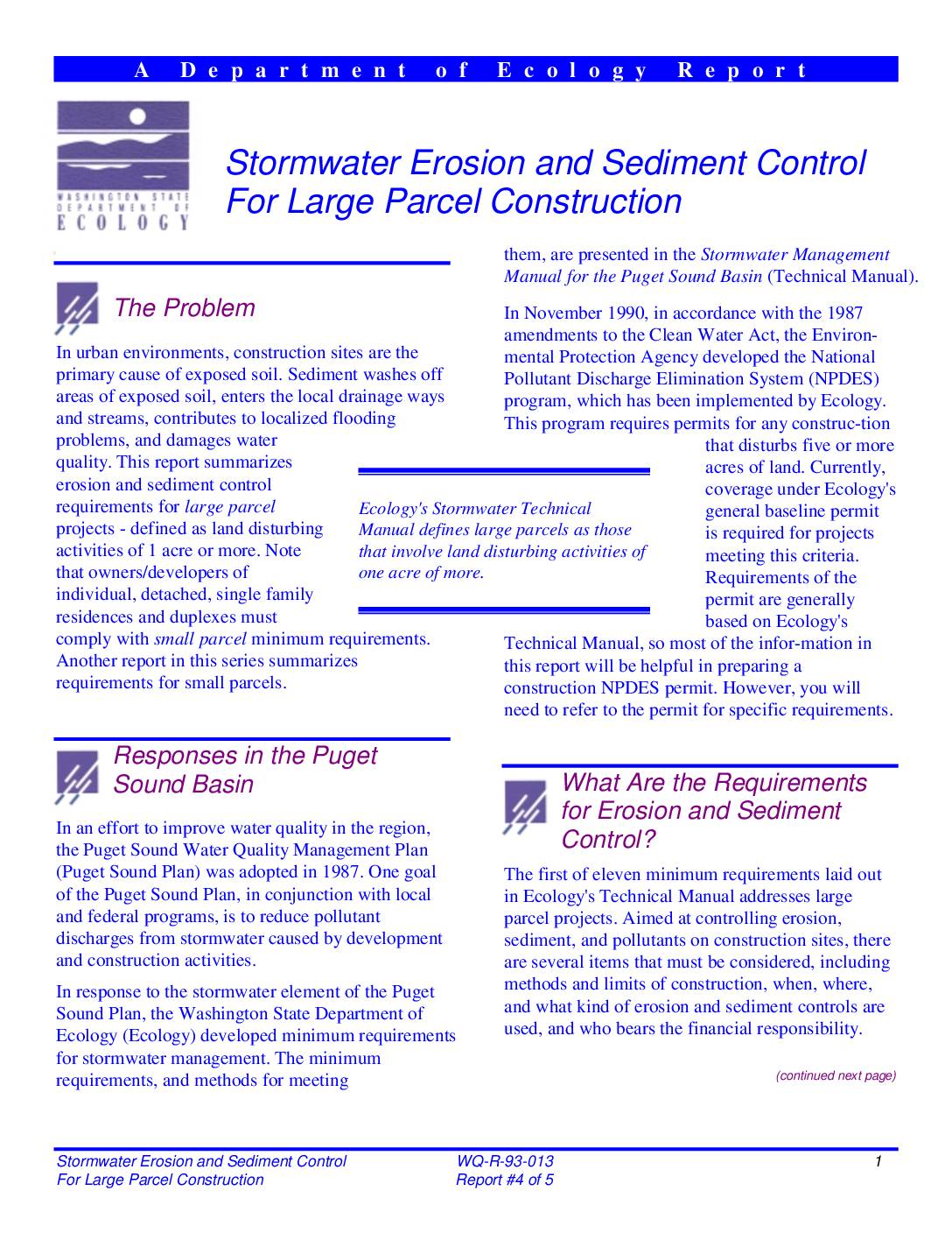 A D e p a r t m e n t o f E c o l o g y R e p o r t Stormwater Erosion and Sediment Control WQ-R-93-013 1 For Large Parcel Construction Report #4 of 5 Ecology's Stormwater Technical Manual defines large parcels as those that involve land disturbing activities of one acre of more. Stormwater Erosion and Sediment Control For Large Parcel Construction The Problem In urban environments, construction sites are the primary cause of exposed soil. Sediment washes off areas of exposed soil, enters the local drainage ways and streams, contributes to localized flooding problems, and damages water quality. This report summarizes erosion and sediment control requirements for large parcel projects - defined as land disturbing activities of 1 acre or more. Note that owners/developers of individual, detached, single family residences and duplexes must comply with small parcel minimum requirements. Another report in this series summarizes requirements for small parcels. Responses in the Puget Sound Basin In an effort to improve water quality in the region, the Puget Sound Water Quality Management Plan (Puget Sound Plan) was adopted in 1987. One goal of the Puget Sound Plan, in conjunction with local and federal programs, is to reduce pollutant discharges from stormwater caused by development and construction activities. In response to the stormwater element of the Puget Sound Plan, the Washington State Department of Ecology (Ecology) developed minimum requirements for stormwater management. The minimum requirements, and methods for meeting them, are presented in the… -