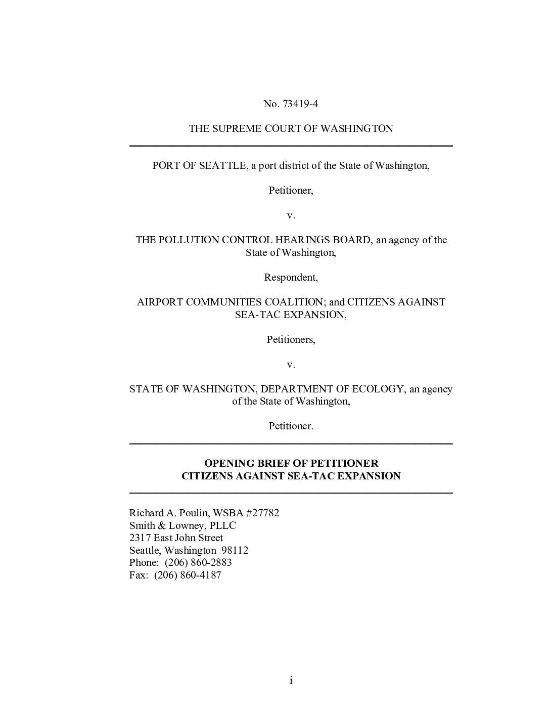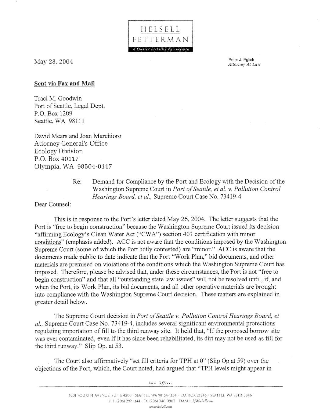 September 1999. The Port submitted its second application to the U.S. Army Corps of Engineers and to the Department of Ecology, after having to withdraw its 1997 application because of gross under-statement of the amount of wetlands involved. Ecology had 365 days to pass on the application. The Engineers had previously announced that they would not decide till after Ecology had finished its work. Spring & Summer 2000. Port of Seattle submitted voluminous revised documents, attempting to justify the plan, some as late as late August. Ecology, Engineers, and King County stormwater experts, as well as experts retained by Airport Communities Coalition, RCAA, and C.A.S.E., raised a host of questions. September 2000. A meeting—not publicly announced—was held at the office of M.R. ("Mic") Dinsmore, Executive Director of the Port of Seattle. Those present included: Joe Dear, the Governor's Chief of Staff; Mr Dinsmore; Tom Fitzsimmons, the Director of the Department of Ecology; Ray Hellwig, head of the regional office of Ecology; and others. Mr Dinsmore was a major fund-raiser for Gov. Gary Locke in the last general election. The Governor and Ecology have denied that there is any political pressure in this affair, though Ecology has been officially warned that there is interest in this project "at the highest levels" of State government. The Ecology folks brought with them their draft letter of decision on the sec. 401 application, dated that day, and shared it with the others. The letter flatly denied the application, because of multiple shortcomings. "At this… -