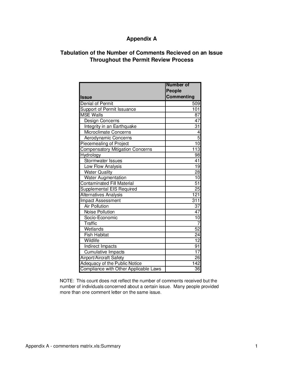 Tabulation of the Number of Comments Recieved on an Issue Throughout the Permit Review Process Issue Number of People Commenting Denial of Permit 509 Support of Permit Issuance 101 MSE Walls 87 Design Concerns 47 Integrity in an Earthquake 31 Microclimate Concerns 4 Aerodynamic Concerns 5 Piecemealing of Project 10 Compensatory Mitigation Concerns 113 Hydrology 98 Stormwater Issues 41 Low Flow Analysis 19 Water Quality 28 Water Augmentation 10 Contaminated Fill Material 51 Supplemental EIS Required 25 Alternatives Analysis 121 Impact Assessment 311 Air Pollution 37 Noise Pollution 47 Socio-Economic 10 Traffic 7 Wetlands 52 Fish Habitat 24 Wildlife 12 Indirect Impacts 91 Cumulative Impacts 17 Airport/Aircraft Safety 26 Adequacy of the Public Notice 142 Compliance with Other Applicable Laws 36 NOTE: This count does not reflect the number of comments received but the number of individuals concerned about a certain issue. Many people provided more than one comment letter on the same issue. Appendix A - commenters matrix.xls:Summary 1 Appendix A - Index of Comments Recieved Throughout Permit Review Process A B C Name Issue Paragraph Number Abeyta, Janeen and Robert Denial of Permit 10(A)(1) Adair, Will Alternatives Analysis 10(A)(9) Affiliated Tribes of NW Indians Economic Devel. Corp. (M. Ufkes) Impact Assessment - Fish Habitat 10(A)(10)(f) Air Line Pilots Association, International Support of Permit Issuance 10(A)(2) Air Transportation Association of America (E. Merlis) Support of Permit Issuance 10(A)(2) Airport Communities Coalition (ACC) (B. Sheckler) Denial of Permit 10(A)(1) MSE Walls - Design Concerns 10(A)(3)(a) MSE Walls - Integrity in… -