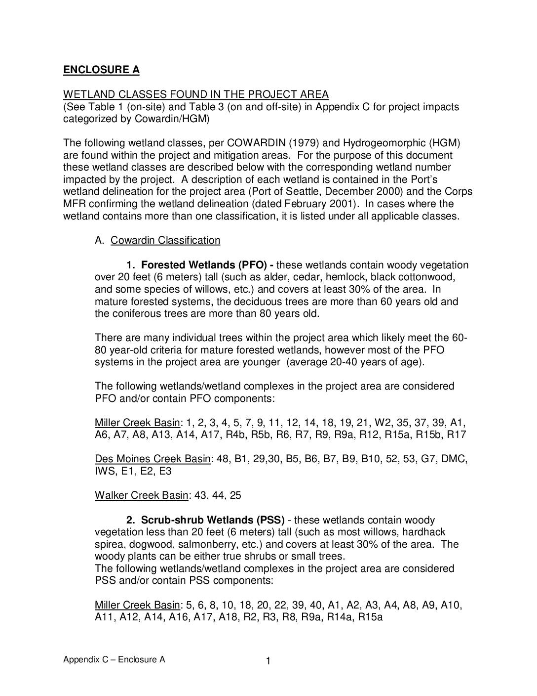 (See Table 1 (on-site) and Table 3 (on and off-site) in Appendix C for project impacts categorized by Cowardin/HGM) The following wetland classes, per COWARDIN (1979) and Hydrogeomorphic (HGM) are found within the project and mitigation areas. For the purpose of this document these wetland classes are described below with the corresponding wetland number impacted by the project. A description of each wetland is contained in the Port’s wetland delineation for the project area (Port of Seattle, December 2000) and the Corps MFR confirming the wetland delineation (dated February 2001). In cases where the wetland contains more than one classification, it is listed under all applicable classes. A. Cowardin Classification 1. Forested Wetlands (PFO) - these wetlands contain woody vegetation over 20 feet (6 meters) tall (such as alder, cedar, hemlock, black cottonwood, and some species of willows, etc.) and covers at least 30% of the area. In mature forested systems, the deciduous trees are more than 60 years old and the coniferous trees are more than 80 years old. There are many individual trees within the project area which likely meet the 60- year-old criteria for mature forested wetlands, however most of the PFO systems in the project area are younger (average 20-40 years of age). The following wetlands/wetland complexes in the project area are considered PFO and/or contain PFO components: Miller Creek Basin: 1, 2, 3, 4, 5, 7, 9, 11, 12, 14, 18, 19, 21, W2, 35, 37, 39, A1, A6, A7, A8, A13, A14, A17, R4b,… -