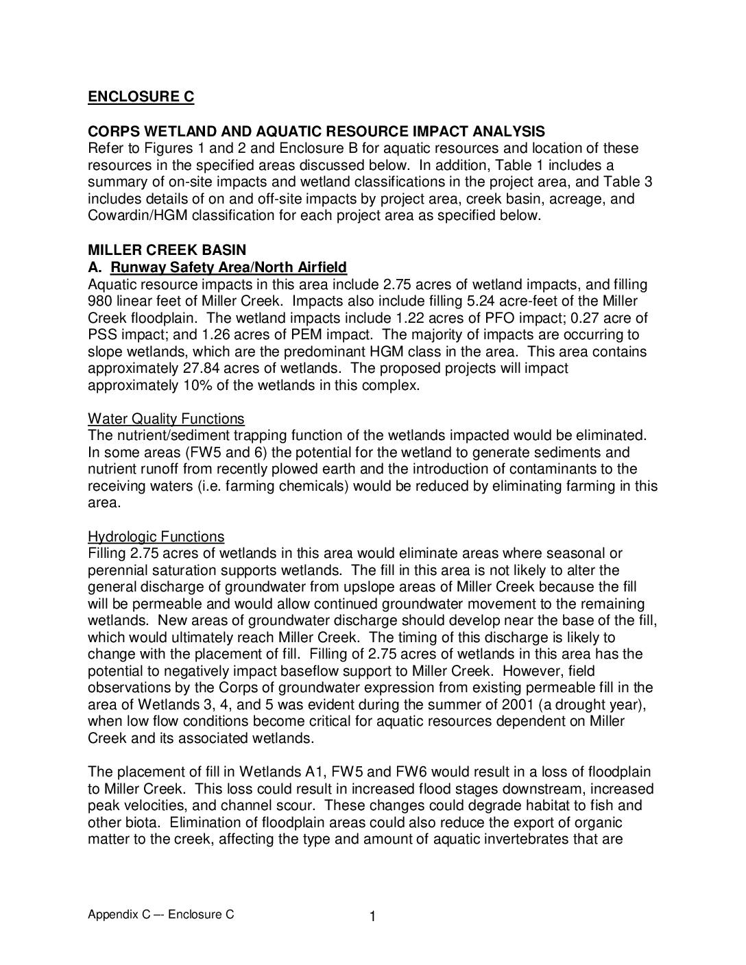 Refer to Figures 1 and 2 and Enclosure B for aquatic resources and location of these resources in the specified areas discussed below. In addition, Table 1 includes a summary of on-site impacts and wetland classifications in the project area, and Table 3 includes details of on and off-site impacts by project area, creek basin, acreage, and Cowardin/HGM classification for each project area as specified below. MILLER CREEK BASIN A. Runway Safety Area/North Airfield Aquatic resource impacts in this area include 2.75 acres of wetland impacts, and filling 980 linear feet of Miller Creek. Impacts also include filling 5.24 acre-feet of the Miller Creek floodplain. The wetland impacts include 1.22 acres of PFO impact; 0.27 acre of PSS impact; and 1.26 acres of PEM impact. The majority of impacts are occurring to slope wetlands, which are the predominant HGM class in the area. This area contains approximately 27.84 acres of wetlands. The proposed projects will impact approximately 10% of the wetlands in this complex. Water Quality Functions The nutrient/sediment trapping function of the wetlands impacted would be eliminated. In some areas (FW5 and 6) the potential for the wetland to generate sediments and nutrient runoff from recently plowed earth and the introduction of contaminants to the receiving waters (i.e. farming chemicals) would be reduced by eliminating farming in this area. Hydrologic Functions Filling 2.75 acres of wetlands in this area would eliminate areas where seasonal or perennial saturation supports wetlands. The fill in this area is not likely to alter… -
