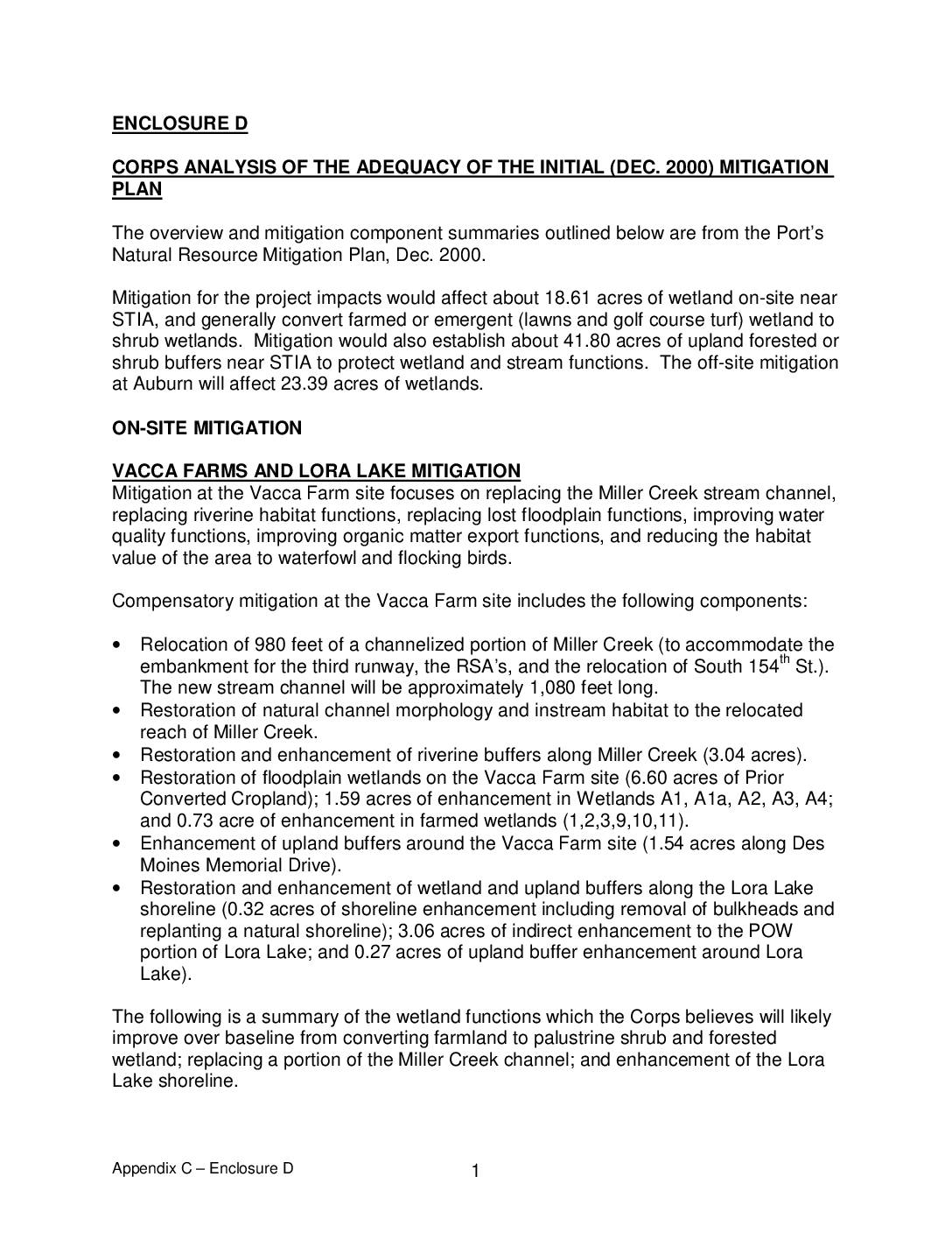 The overview and mitigation component summaries outlined below are from the Port’s Natural Resource Mitigation Plan, Dec. 2000. Mitigation for the project impacts would affect about 18.61 acres of wetland on-site near STIA, and generally convert farmed or emergent (lawns and golf course turf) wetland to shrub wetlands. Mitigation would also establish about 41.80 acres of upland forested or shrub buffers near STIA to protect wetland and stream functions. The off-site mitigation at Auburn will affect 23.39 acres of wetlands. ON-SITE MITIGATION VACCA FARMS AND LORA LAKE MITIGATION Mitigation at the Vacca Farm site focuses on replacing the Miller Creek stream channel, replacing riverine habitat functions, replacing lost floodplain functions, improving water quality functions, improving organic matter export functions, and reducing the habitat value of the area to waterfowl and flocking birds. Compensatory mitigation at the Vacca Farm site includes the following components: • Relocation of 980 feet of a channelized portion of Miller Creek (to accommodate the embankment for the third runway, the RSA’s, and the relocation of South 154th St.). The new stream channel will be approximately 1,080 feet long. • Restoration of natural channel morphology and instream habitat to the relocated reach of Miller Creek. • Restoration and enhancement of riverine buffers along Miller Creek (3.04 acres). • Restoration of floodplain wetlands on the Vacca Farm site (6.60 acres of Prior Converted Cropland); 1.59 acres of enhancement in Wetlands A1, A1a, A2, A3, A4; and 0.73 acre of enhancement in farmed wetlands (1,2,3,9,10,11). • Enhancement of upland…
