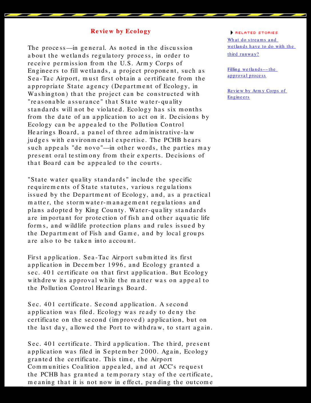 The process—in general. As noted in the discussion about the wetlands regulatory process, in order to receive permission from the U.S. Army Corps of Engineers to fill wetlands, a project proponent, such as Sea-Tac Airport, must first obtain a certificate from the appropriate State agency (Department of Ecology, in Washington) that the project can be constructed with "reasonable assurance" that State water-quality standards will not be violated. Ecology has six months from the date of an application to act on it. Decisions by Ecology can be appealed to the Pollution Control Hearings Board, a panel of three administrative-law judges with environmental expertise. The PCHB hears such appeals "de novo"—in other words, the parties may present oral testimony from their experts. Decisions of that Board can be appealed to the courts. "State water quality standards" include the specific requirements of State statutes, various regulations issued by the Department of Ecology, and, as a practical matter, the stormwater-management regulations and plans adopted by King County. Water-quality standards are important for protection of fish and other aquatic life forms, and wildlife protection plans and rules issued by the Department of Fish and Game, and by local groups are also to be taken into account. First application. Sea-Tac Airport submitted its first application in December 1996, and Ecology granted a sec. 401 certificate on that first application. But Ecology withdrew its approval while the matter was on appeal to the Pollution Control Hearings Board. Sec. 401 certificate. Second application. A second application was filed.… -