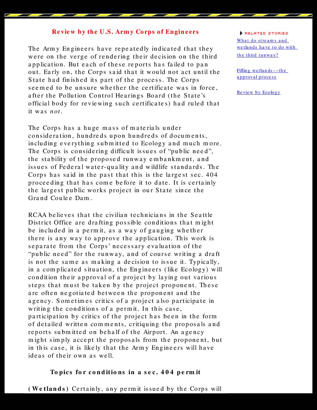 Review by the U.S. Army Corps of Engineers The Army Engineers have repeatedly indicated that they were on the verge of rendering their decision on the third application. But each of these reports has failed to pan out. Early on, the Corps said that it would not act until the State had finished its part of the process. The Corps seemed to be unsure whether the certificate was in force, after the Pollution Control Hearings Board (the State’s official body for reviewing such certificates) had ruled that it was not. The Corps has a huge mass of materials under consideration, hundreds upon hundreds of documents, including everything submitted to Ecology and much more. The Corps is considering difficult issues of “public need”, the stability of the proposed runway embankment, and issues of Federal water-quality and wildlife standards. The Corps has said in the past that this is the largest sec. 404 proceeding that has come before it to date. It is certainly the largest public works project in our State since the Grand Coulee Dam. RCAA believes that the civilian technicians in the Seattle District Office are drafting possible conditions that might be included in a permit, as a way of gauging whether there is any way to approve the application. This work is separate from the Corps’ necessary evaluation of the “public need” for the runway, and of course writing a draft is not the same as making a decision to issue it. Typically, in a complicated situation, the… -