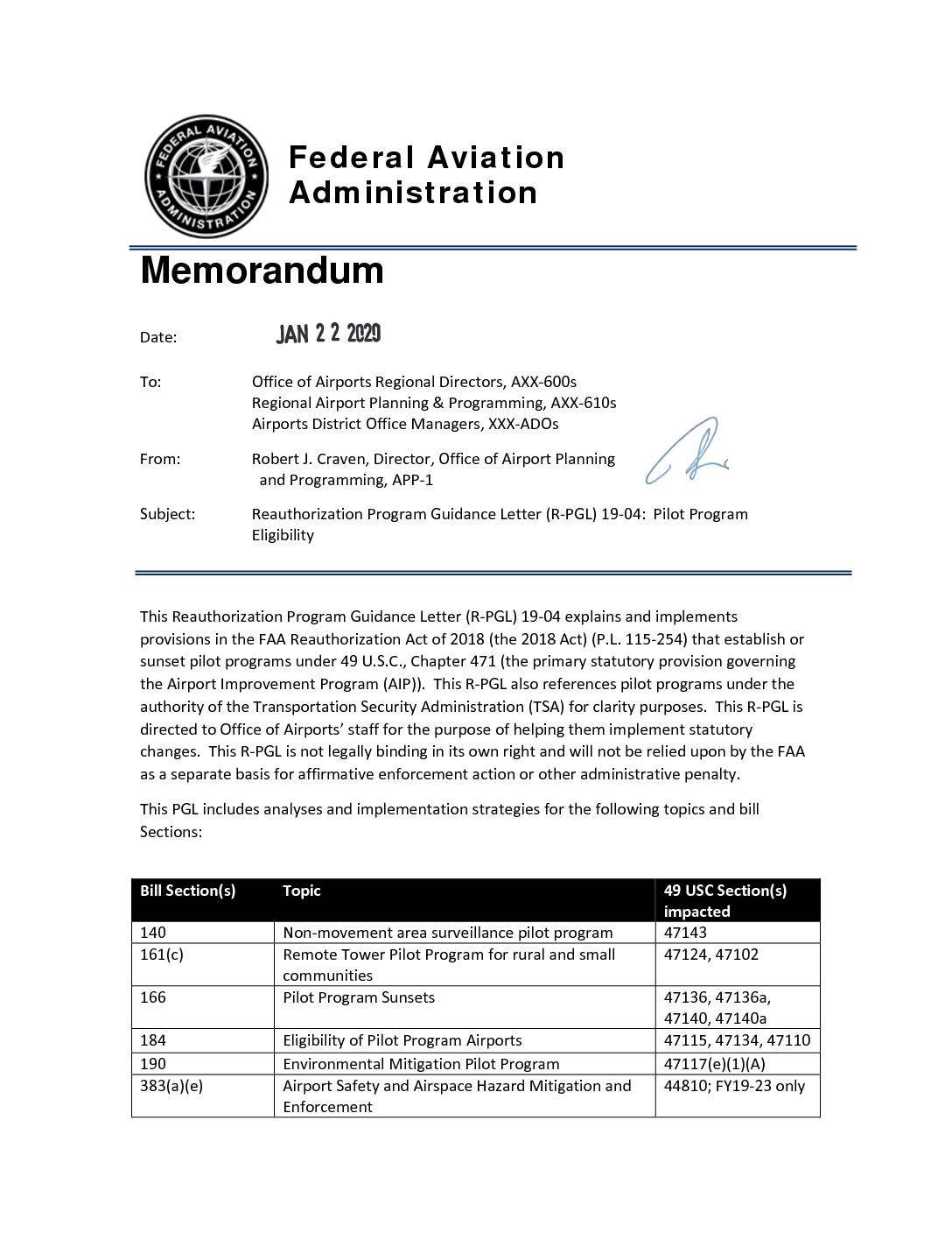 To: Office of Airports Regional Directors, AXX‐600s Regional Airport Planning & Programming, AXX‐610s Airports District Office Managers, XXX‐ADOs From: Robert J. Craven, Director, Office of Airport Planning and Programming, APP‐1 Subject: Reauthorization Program Guidance Letter (R‐PGL) 19‐04: Pilot Program Eligibility This Reauthorization Program Guidance Letter (R‐PGL) 19‐04 explains and implements provisions in the FAA Reauthorization Act of 2018 (the 2018 Act) (P.L. 115‐254) that establish or sunset pilot programs under 49 U.S.C., Chapter 471 (the primary statutory provision governing the Airport Improvement Program (AIP)). This R‐PGL also references pilot programs under the authority of the Transportation Security Administration (TSA) for clarity purposes. This R‐PGL is directed to Office of Airports’ staff for the purpose of helping them implement statutory changes. This R‐PGL is not legally binding in its own right and will not be relied upon by the FAA as a separate basis for affirmative enforcement action or other administrative penalty. This PGL includes analyses and implementation strategies for the following topics and bill Sections: Bill Section(s) Topic 49 USC Section(s) impacted 140 Non‐movement area surveillance pilot program 47143 161(c) Remote Tower Pilot Program for rural and small communities 47124, 47102 166 Pilot Program Sunsets 47136, 47136a, 47140, 47140a 184 Eligibility of Pilot Program Airports 47115, 47134, 47110 190 Environmental Mitigation Pilot Program 47117(e)(1)(A) 383(a)(e) Airport Safety and Airspace Hazard Mitigation and Enforcement 44810; FY19‐23 only JAN 2 2 2020