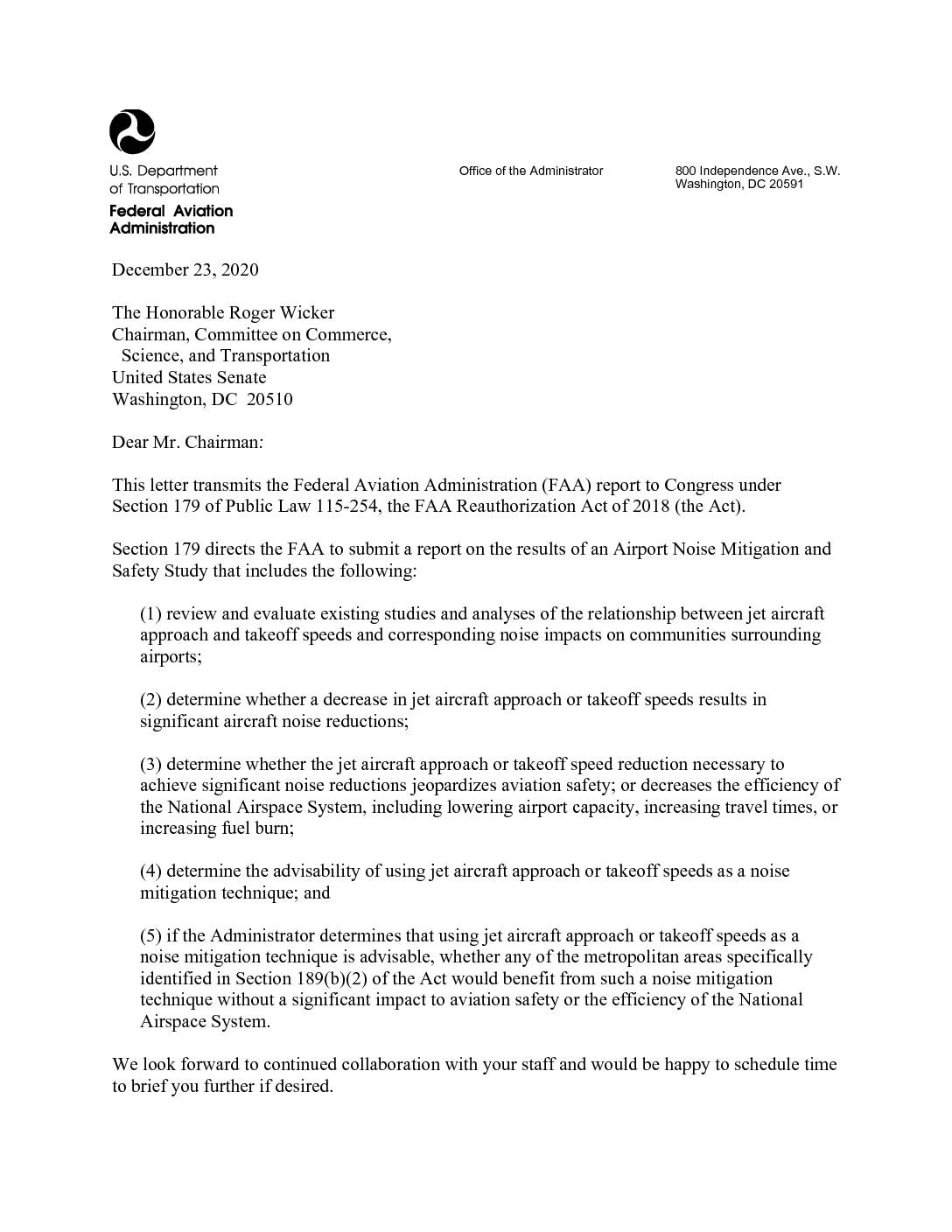 Office of the Administrator 800 Independence Ave., S.W. Washington, DC 20591 December 23, 2020 The Honorable Roger Wicker Chairman, Committee on Commerce, Science, and Transportation United States Senate Washington, DC 20510 Dear Mr. Chairman: This letter transmits the Federal Aviation Administration (FAA) report to Congress under Section 179 of Public Law 115-254, the FAA Reauthorization Act of 2018 (the Act). Section 179 directs the FAA to submit a report on the results of an Airport Noise Mitigation and Safety Study that includes the following: (1) review and evaluate existing studies and analyses of the relationship between jet aircraft approach and takeoff speeds and corresponding noise impacts on communities surrounding airports; (2) determine whether a decrease in jet aircraft approach or takeoff speeds results in significant aircraft noise reductions; (3) determine whether the jet aircraft approach or takeoff speed reduction necessary to achieve significant noise reductions jeopardizes aviation safety; or decreases the efficiency of the National Airspace System, including lowering airport capacity, increasing travel times, or increasing fuel burn; (4) determine the advisability of using jet aircraft approach or takeoff speeds as a noise mitigation technique; and (5) if the Administrator determines that using jet aircraft approach or takeoff speeds as a noise mitigation technique is advisable, whether any of the metropolitan areas specifically identified in Section 189(b)(2) of the Act would benefit from such a noise mitigation technique without a significant impact to aviation safety or the efficiency of the National Airspace System. We look forward to continued collaboration with… -