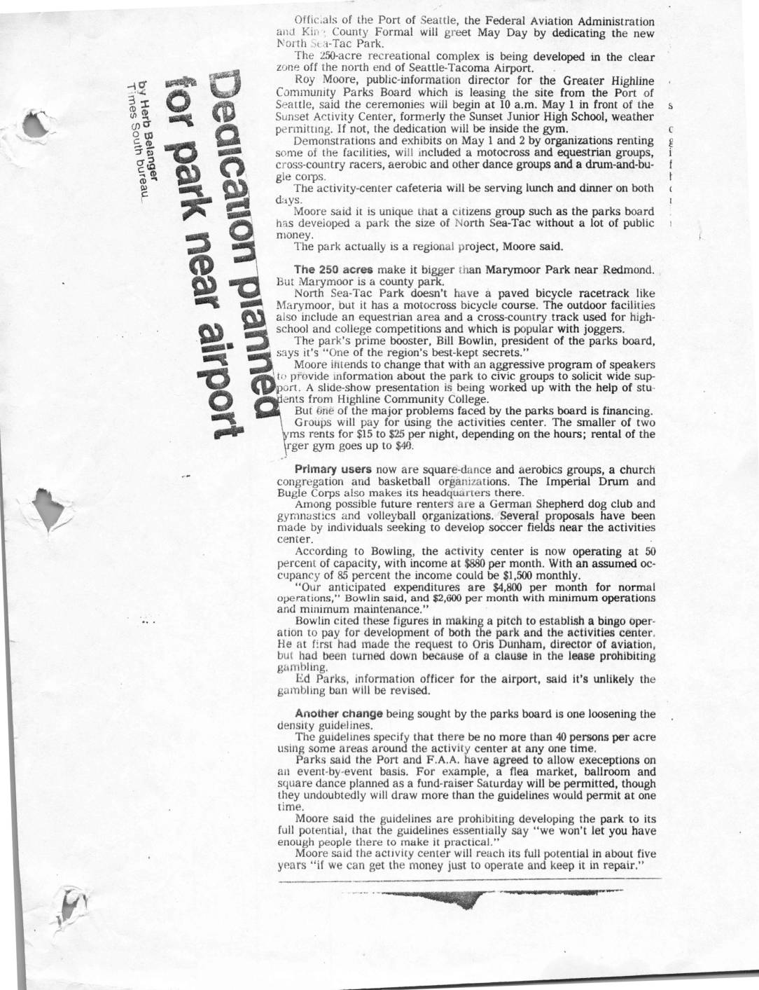 Officials of tIle Port of Seattle, the Federal Aviation Administration at} J Xii' ' County Formal will greet May Day by dedicating the new Noi’tIl .';c A-Tac Park. The 2%acre recreational complex is being developed h the clear zone off the north end of Seattle-Tacoma Airpoit. RoY Moore, public-information director for the Greater Highline Cornmunity Parks Board which is leasing the site from the Port of Seattle, said the ceremonies will begin at 10 a.m. May 1 in front of the Sunset Activity Center, fonnerly the Sunset Junior High Sch CDI, weather permittIng. If not, the dedication will tn inside the gym. Demonstrations and exhibits on May 1 and 2 by organizations renting some of the facilities, will included a motocross and equestrian groups, cross-country racers, aerobic and other dance groups and a drum-and.bu- gle COIPS. The activity-center cafeteria will be serving lunch and dinner on both days, Moore said it is unique that a citizens group such as the parks board has deveior)ed a park the size of North Sea-Tac without a lot of public niorley , The park actually is a regiona£ project, Moore said. $ : V Sg sdR S ( g f t ( / a'S The 250 acres make it bigger i}ian Marymoor Park near Redmond. alHI But Matymoor is a county park. Bbl AT aHLhor?(iaJ:fh;sa;krr:=i=ssh IT:yBelTJIgiejb$:£l:u{£££}r?ic£li{iiS WH- Vms rents for $15 to $25 per night, depending on the hours; rental of the rger gynr goes UP to W. aa PrImary users now are square-dance…