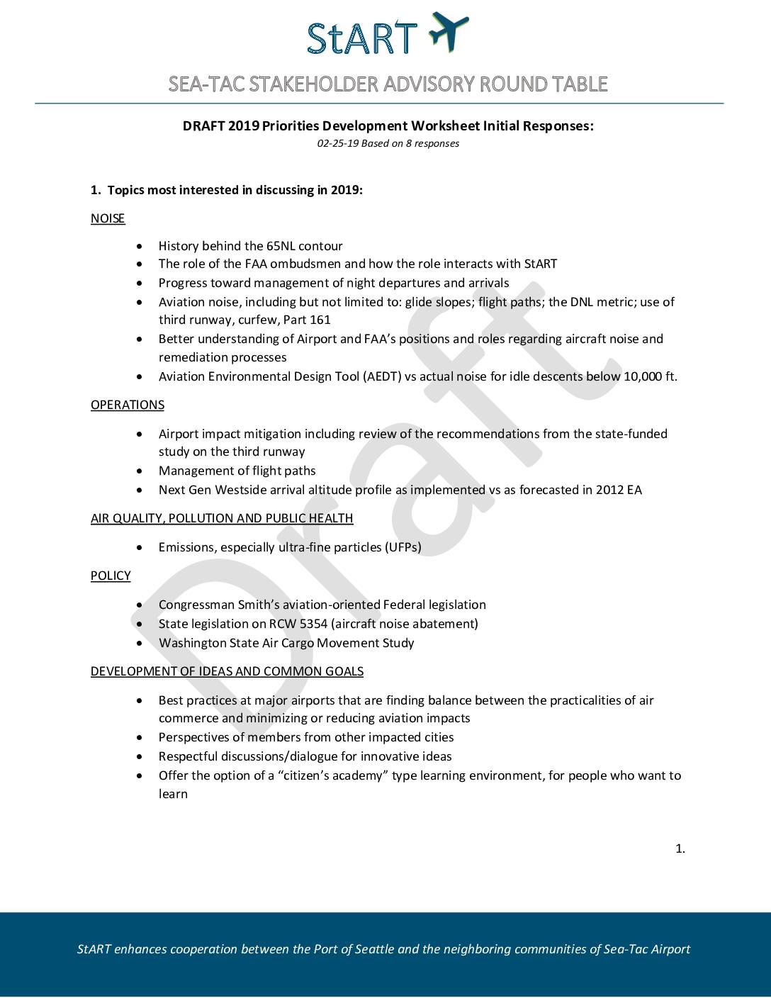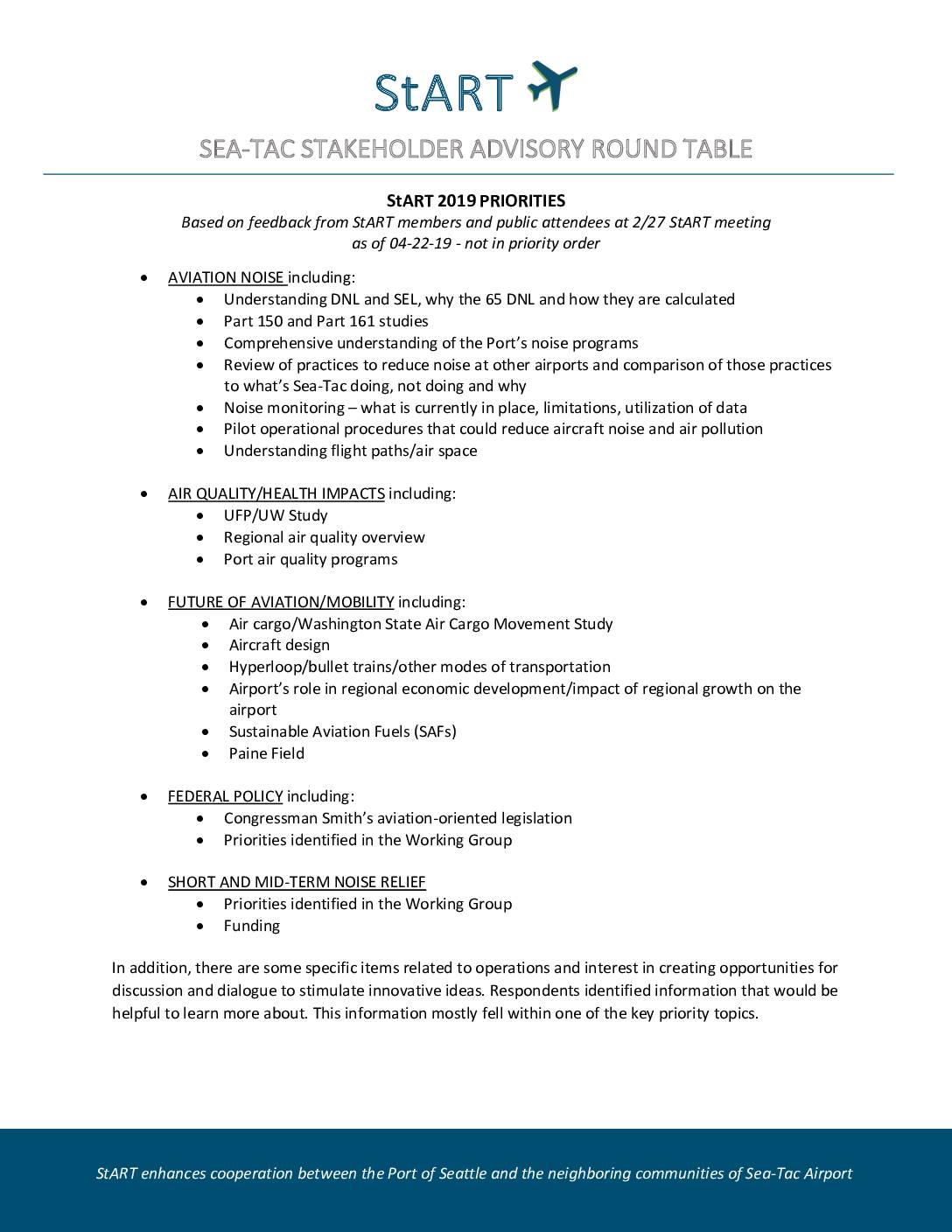 StART enhances cooperation between the Port of Seattle and the neighboring communities of Sea-Tac Airport DRAFT 2019 Priorities Development Worksheet Initial Responses: 02-25-19 Based on 8 responses 1. Topics most interested in discussing in 2019: NOISE • History behind the 65NL contour • The role of the FAA ombudsmen and how the role interacts with StART • Progress toward management of night departures and arrivals • Aviation noise, including but not limited to: glide slopes; flight paths; the DNL metric; use of third runway, curfew, Part 161 • Better understanding of Airport and FAA’s positions and roles regarding aircraft noise and remediation processes • Aviation Environmental Design Tool (AEDT) vs actual noise for idle descents below 10,000 ft. OPERATIONS • Airport impact mitigation including review of the recommendations from the state-funded study on the third runway • Management of flight paths • Next Gen Westside arrival altitude profile as implemented vs as forecasted in 2012 EA AIR QUALITY, POLLUTION AND PUBLIC HEALTH • Emissions, especially ultra-fine particles (UFPs) POLICY • Congressman Smith’s aviation-oriented Federal legislation • State legislation on RCW 5354 (aircraft noise abatement) • Washington State Air Cargo Movement Study DEVELOPMENT OF IDEAS AND COMMON GOALS • Best practices at major airports that are finding balance between the practicalities of air commerce and minimizing or reducing aviation impacts • Perspectives of members from other impacted cities • Respectful discussions/dialogue for innovative ideas • Offer the option of a “citizen’s academy” type learning environment, for people who want to learn… -