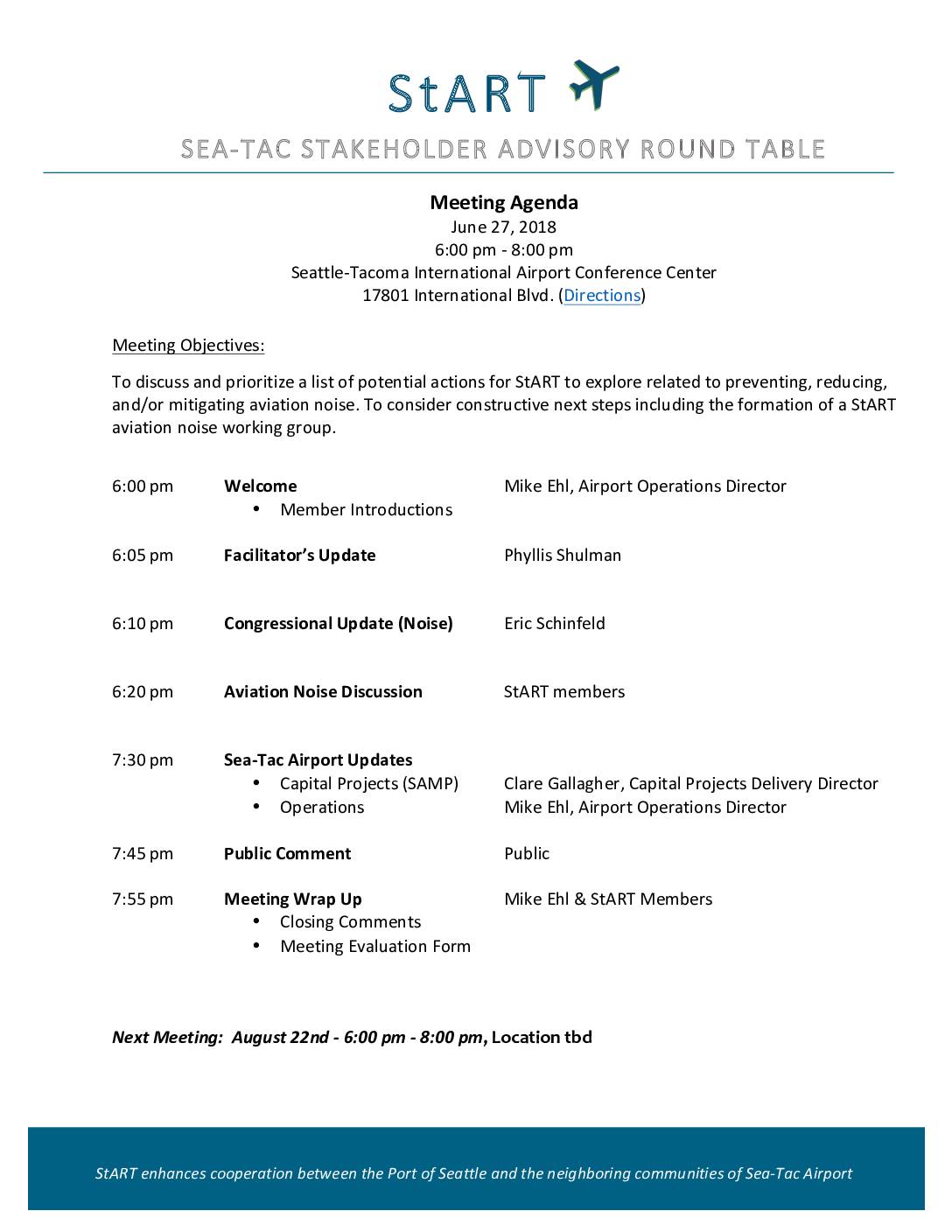 StART enhances cooperation between the Port of Seattle and the neighboring communities of Sea-Tac Airport Meeting Agenda June 27, 2018 6:00 pm - 8:00 pm Seattle-Tacoma International Airport Conference Center 17801 International Blvd. (Directions) Meeting Objectives: To discuss and prioritize a list of potential actions for StART to explore related to preventing, reducing, and/or mitigating aviation noise. To consider constructive next steps including the formation of a StART aviation noise working group. 6:00 pm Welcome Mike Ehl, Airport Operations Director • Member Introductions 6:05 pm Facilitator’s Update Phyllis Shulman 6:10 pm Congressional Update (Noise) Eric Schinfeld 6:20 pm Aviation Noise Discussion StART members 7:30 pm Sea-Tac Airport Updates • Capital Projects (SAMP) Clare Gallagher, Capital Projects Delivery Director • Operations Mike Ehl, Airport Operations Director 7:45 pm Public Comment Public 7:55 pm Meeting Wrap Up Mike Ehl & StART Members • Closing Comments • Meeting Evaluation Form -