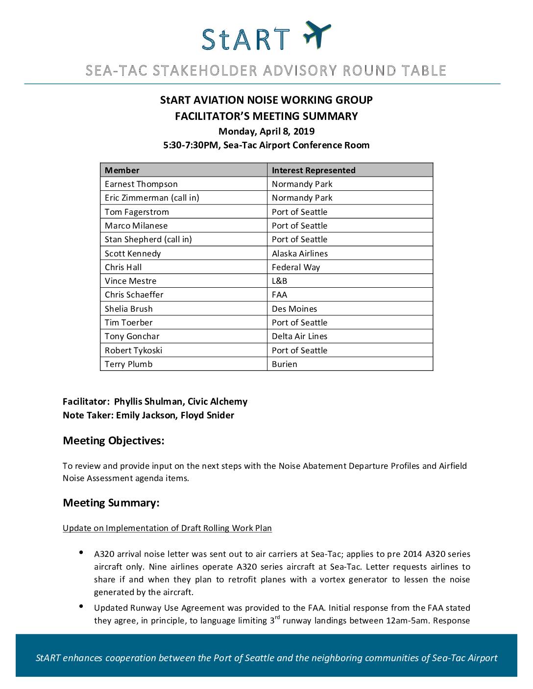StART enhances cooperation between the Port of Seattle and the neighboring communities of Sea-Tac Airport StART AVIATION NOISE WORKING GROUP FACILITATOR’S MEETING SUMMARY Monday, April 8, 2019 5:30-7:30PM, Sea-Tac Airport Conference Room Member Interest Represented Earnest Thompson Normandy Park Eric Zimmerman (call in) Normandy Park Tom Fagerstrom Port of Seattle Marco Milanese Port of Seattle Stan Shepherd (call in) Port of Seattle Scott Kennedy Alaska Airlines Chris Hall Federal Way Vince Mestre L&B Chris Schaeffer FAA Shelia Brush Des Moines Tim Toerber Port of Seattle Tony Gonchar Delta Air Lines Robert Tykoski Port of Seattle Terry Plumb Burien Facilitator: Phyllis Shulman, Civic Alchemy Note Taker: Emily Jackson, Floyd Snider Meeting Objectives: To review and provide input on the next steps with the Noise Abatement Departure Profiles and Airfield Noise Assessment agenda items. Meeting Summary: Update on Implementation of Draft Rolling Work Plan • A320 arrival noise letter was sent out to air carriers at Sea-Tac; applies to pre 2014 A320 series aircraft only. Nine airlines operate A320 series aircraft at Sea-Tac. Letter requests airlines to share if and when they plan to retrofit planes with a vortex generator to lessen the noise generated by the aircraft. • Updated Runway Use Agreement was provided to the FAA. Initial response from the FAA stated they agree, in principle, to language limiting 3rd runway landings between 12am-5am. Response April 8, 2019 StART Facilitator’s Meeting Summary April 8, 2019 Page 2 included additional comments. Next steps include completing discussion and any revisions to language… -