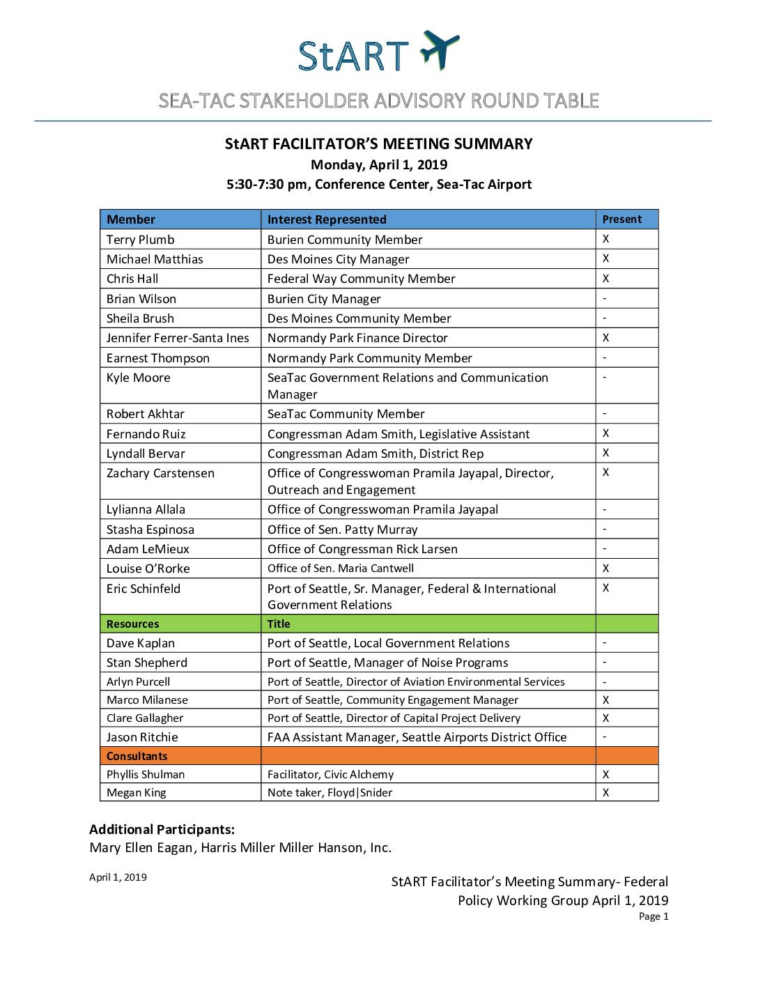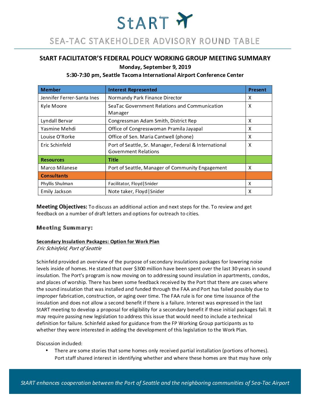 StART enhances cooperation between the Port of Seattle and the neighboring communities of Sea-Tac Airport StART FACILITATOR’S FEDERAL POLICY WORKING GROUP MEETING SUMMARY Monday, September 9, 2019 5:30-7:30 pm, Seattle Tacoma International Airport Conference Center Member Interest Represented Present Jennifer Ferrer-Santa Ines Normandy Park Finance Director X Kyle Moore SeaTac Government Relations and Communication Manager X Lyndall Bervar Congressman Adam Smith, District Rep X Yasmine Mehdi Office of Congresswoman Pramila Jayapal X Louise O’Rorke Office of Sen. Maria Cantwell (phone) X Eric Schinfeld Port of Seattle, Sr. Manager, Federal & International Government Relations X Resources Title Marco Milanese Port of Seattle, Manager of Community Engagement X Consultants Phyllis Shulman Facilitator, Floyd|Snider X Emily Jackson Note taker, Floyd|Snider X Meeting Objectives: To discuss an additional action and next steps for the. To review and get feedback on a number of draft letters and options for outreach to cities. Meeting Summary: Secondary Insulation Packages: Option for Work Plan Eric Schinfeld, Port of Seattle Schinfeld provided an overview of the purpose of secondary insulations packages for lowering noise levels inside of homes. He stated that over $300 million have been spent over the last 30 years in sound insulation. The Port’s program is now moving on to addressing sound insulation in apartments, condos, and places of worship. There has been some feedback received by the Port that there are cases where the sound insulation that was installed and funded through the FAA and Port has failed possibly due to improper fabrication, construction, or…