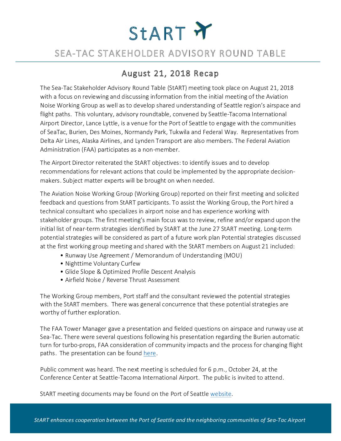 StART enhances cooperation between the Port of Seattle and the neighboring communities of Sea-Tac Airport August 21, 2018 Recap The Sea-Tac Stakeholder Advisory Round Table (StART) meeting took place on August 21, 2018 with a focus on reviewing and discussing information from the initial meeting of the Aviation Noise Working Group as well as to develop shared understanding of Seattle region’s airspace and flight paths. This voluntary, advisory roundtable, convened by Seattle-Tacoma International Airport Director, Lance Lyttle, is a venue for the Port of Seattle to engage with the communities of SeaTac, Burien, Des Moines, Normandy Park, Tukwila and Federal Way. Representatives from Delta Air Lines, Alaska Airlines, and Lynden Transport are also members. The Federal Aviation Administration (FAA) participates as a non-member. The Airport Director reiterated the StART objectives: to identify issues and to develop recommendations for relevant actions that could be implemented by the appropriate decision- makers. Subject matter experts will be brought on when needed. The Aviation Noise Working Group (Working Group) reported on their first meeting and solicited feedback and questions from StART participants. To assist the Working Group, the Port hired a technical consultant who specializes in airport noise and has experience working with stakeholder groups. The first meeting’s main focus was to review, refine and/or expand upon the initial list of near-term strategies identified by StART at the June 27 StART meeting. Long-term potential strategies will be considered as part of a future work plan Potential strategies discussed at the first working group meeting… -