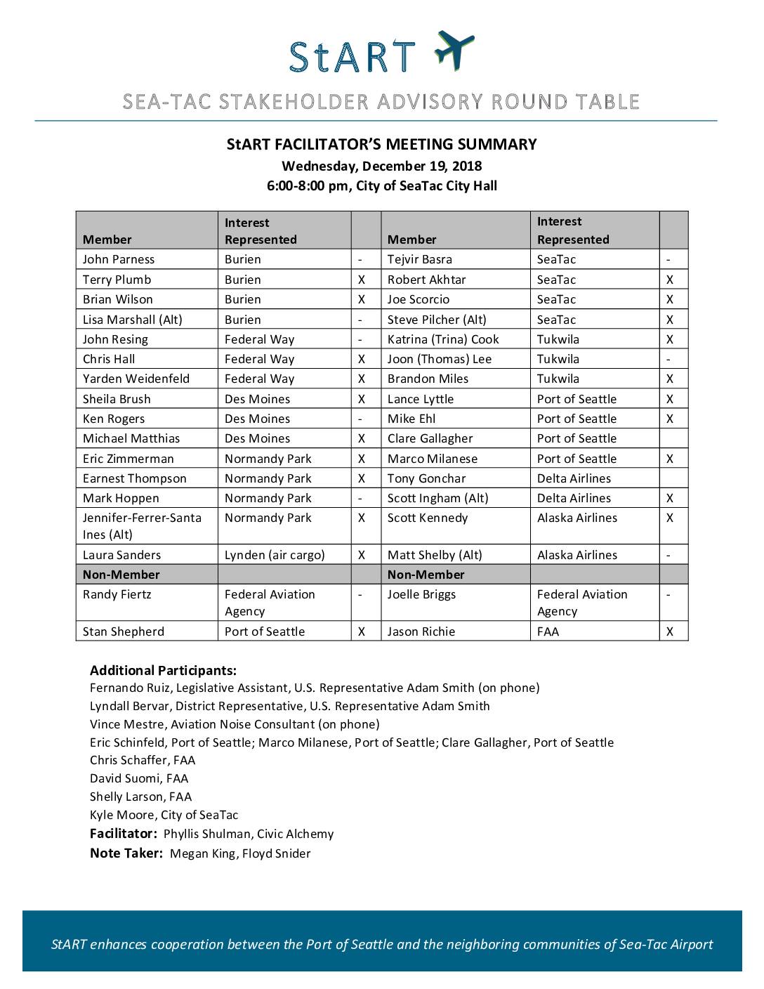 StART enhances cooperation between the Port of Seattle and the neighboring communities of Sea-Tac Airport StART FACILITATOR’S MEETING SUMMARY Wednesday, December 19, 2018 6:00-8:00 pm, City of SeaTac City Hall Member Interest Represented Member Interest Represented John Parness Burien - Tejvir Basra SeaTac - Terry Plumb Burien X Robert Akhtar SeaTac X Brian Wilson Burien X Joe Scorcio SeaTac X Lisa Marshall (Alt) Burien - Steve Pilcher (Alt) SeaTac X John Resing Federal Way - Katrina (Trina) Cook Tukwila X Chris Hall Federal Way X Joon (Thomas) Lee Tukwila - Yarden Weidenfeld Federal Way X Brandon Miles Tukwila X Sheila Brush Des Moines X Lance Lyttle Port of Seattle X Ken Rogers Des Moines - Mike Ehl Port of Seattle X Michael Matthias Des Moines X Clare Gallagher Port of Seattle Eric Zimmerman Normandy Park X Marco Milanese Port of Seattle X Earnest Thompson Normandy Park X Tony Gonchar Delta Airlines Mark Hoppen Normandy Park - Scott Ingham (Alt) Delta Airlines X Jennifer-Ferrer-Santa Ines (Alt) Normandy Park X Scott Kennedy Alaska Airlines X Laura Sanders Lynden (air cargo) X Matt Shelby (Alt) Alaska Airlines - Non-Member Non-Member Randy Fiertz Federal Aviation Agency - Joelle Briggs Federal Aviation Agency - Stan Shepherd Port of Seattle X Jason Richie FAA X Additional Participants: Fernando Ruiz, Legislative Assistant, U.S. Representative Adam Smith (on phone) Lyndall Bervar, District Representative, U.S. Representative Adam Smith Vince Mestre, Aviation Noise Consultant (on phone) Eric Schinfeld, Port of Seattle; Marco Milanese, Port of Seattle; Clare Gallagher, Port of… -
