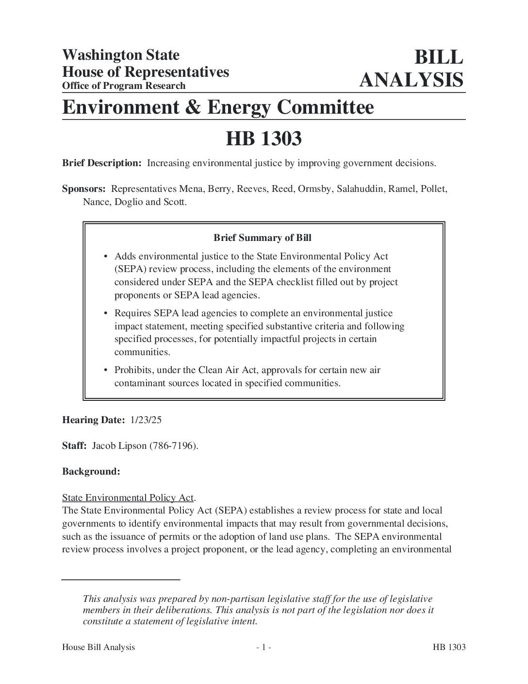 Brief Description: Increasing environmental justice by improving government decisions. Sponsors: Representatives Mena, Berry, Reeves, Reed, Ormsby, Salahuddin, Ramel, Pollet, Nance, Doglio and Scott. Brief Summary of Bill Adds environmental justice to the State Environmental Policy Act (SEPA) review process, including the elements of the environment considered under SEPA and the SEPA checklist filled out by project proponents or SEPA lead agencies. • Requires SEPA lead agencies to complete an environmental justice impact statement, meeting specified substantive criteria and following specified processes, for potentially impactful projects in certain communities. • Prohibits, under the Clean Air Act, approvals for certain new air contaminant sources located in specified communities. • Hearing Date: 1/23/25 Staff: Jacob Lipson (786-7196). Background: State Environmental Policy Act. The State Environmental Policy Act (SEPA) establishes a review process for state and local governments to identify environmental impacts that may result from governmental decisions, such as the issuance of permits or the adoption of land use plans. The SEPA environmental review process involves a project proponent, or the lead agency, completing an environmental This analysis was prepared by non-partisan legislative staff for the use of legislative members in their deliberations. This analysis is not part of the legislation nor does it constitute a statement of legislative intent. Washington State House of Representatives Office of Program Research HB 1303- 1 -House Bill Analysis checklist to identify and evaluate probable environmental impacts. The Department of Ecology (Ecology) has adopted rules that spell out the elements of the environment whose impacts must be… -