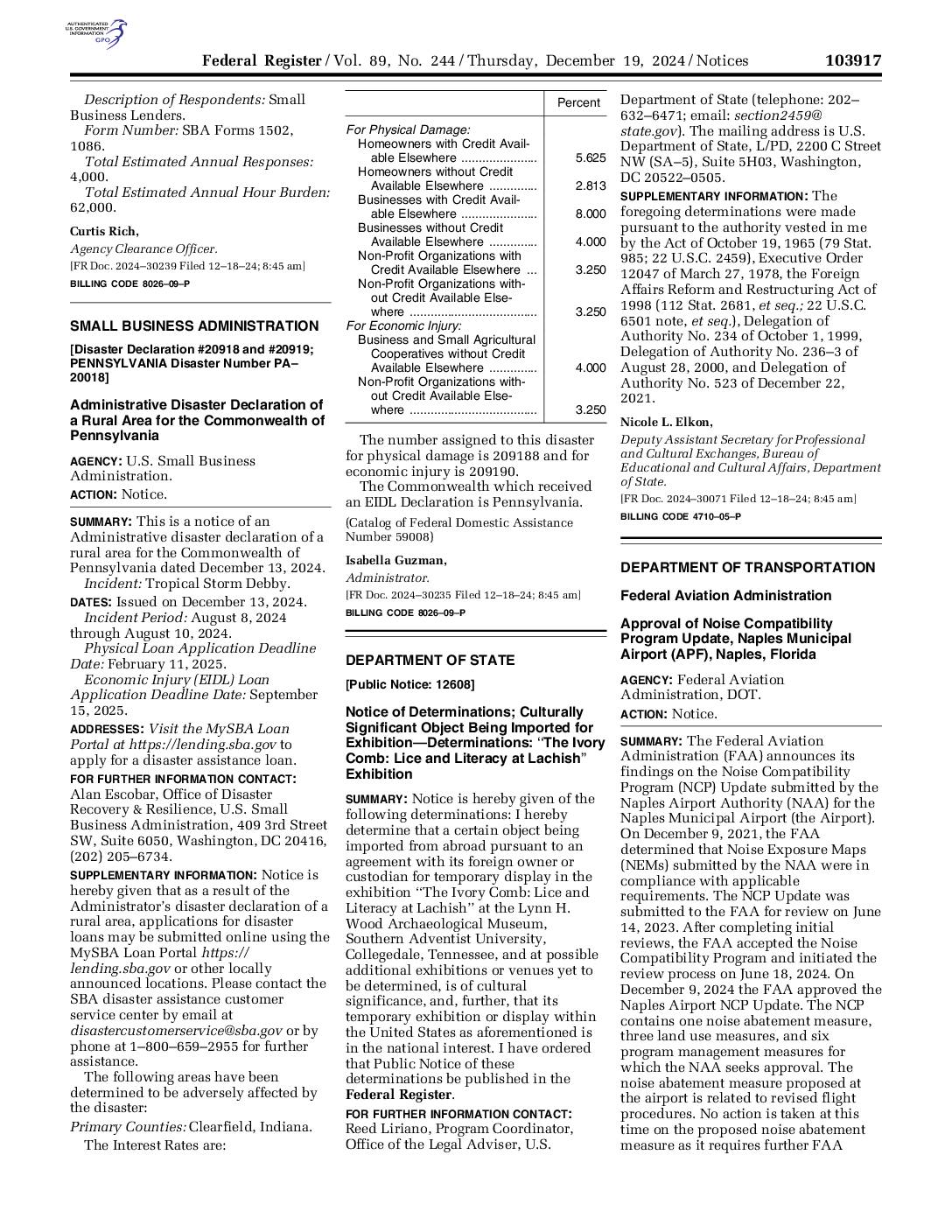 103917 Federal Register / Vol. 89, No. 244 / Thursday, December 19, 2024 / Notices Description of Respondents: Small Business Lenders. Form Number: SBA Forms 1502, 1086. Total Estimated Annual Responses: 4,000. Total Estimated Annual Hour Burden: 62,000. Curtis Rich, Agency Clearance Officer. [FR Doc. 2024–30239 Filed 12–18–24; 8:45 am] BILLING CODE 8026–09–P SMALL BUSINESS ADMINISTRATION [Disaster Declaration #20918 and #20919; PENNSYLVANIA Disaster Number PA– 20018] Administrative Disaster Declaration of a Rural Area for the Commonwealth of Pennsylvania AGENCY: U.S. Small Business Administration. ACTION: Notice. SUMMARY: This is a notice of an Administrative disaster declaration of a rural area for the Commonwealth of Pennsylvania dated December 13, 2024. Incident: Tropical Storm Debby. DATES: Issued on December 13, 2024. Incident Period: August 8, 2024 through August 10, 2024. Physical Loan Application Deadline Date: February 11, 2025. Economic Injury (EIDL) Loan Application Deadline Date: September 15, 2025. ADDRESSES: Visit the MySBA Loan Portal at https://lending.sba.gov to apply for a disaster assistance loan. FOR FURTHER INFORMATION CONTACT: Alan Escobar, Office of Disaster Recovery & Resilience, U.S. Small Business Administration, 409 3rd Street SW, Suite 6050, Washington, DC 20416, (202) 205–6734. SUPPLEMENTARY INFORMATION: Notice is hereby given that as a result of the Administrator’s disaster declaration of a rural area, applications for disaster loans may be submitted online using the MySBA Loan Portal https:// lending.sba.gov or other locally announced locations. Please contact the SBA disaster assistance customer service center by email at disastercustomerservice@sba.gov or by phone at 1–800–659–2955 for further assistance. The following areas… -