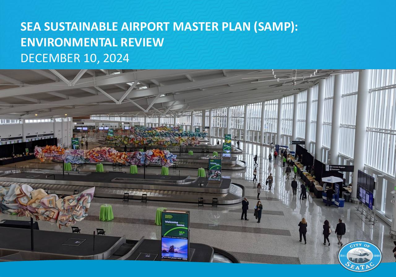 1. The Sustainable Airport Master Plan (SAMP) will result in a significant amount of change at the airport to support increased passenger demand. 2. Provide an overview of the NEPA / SEPA environmental review processes. 3. Provide an update on anticipated technical comments from the City of SeaTac and the 4-city collaborative (Burien, Des Moines, Normandy Park, and SeaTac). 4. Describe anticipated next steps. PRESENTATION OVERVIEW OVERVIEW • The 2018 SAMP proposes improvements needed at the airport to meet future forecast demand. • There are 31 “near term projects” (NTP) in the SAMP intended to address five airport needs: • Passenger terminal capacity • Cargo facilities • FAA required design • Aircraft delays on the airfield • Fuel storage for projected demand • The 31 NTPs include projects like: taxiway extensions (A01), off-site cargo holding (C02, CO3), changes to traffic circulation (L02, L03), employee parking (L07), and a new terminal and gates (T01, T02) SUSTAINABLE AIRPORT MASTER PLAN (SAMP) SUSTAINABLE AIRPORT MASTER PLAN (SAMP) OVERVIEW & PURPOSE • The National Environmental Policy Act (NEPA) requires environmental review of impacts of projects approved by a federal agency. • The purpose of the NEPA environmental review is to: A. Determine if a project will potentially result in negative impacts to the environment B. If there are potential negative environmental impacts: 1. Consider alternatives to the project 2. Mitigate the negative environmental impacts • The Federal Aviation Administration (FAA) administers the NEPA review for airport projects that require FAA approval, consistent with the…