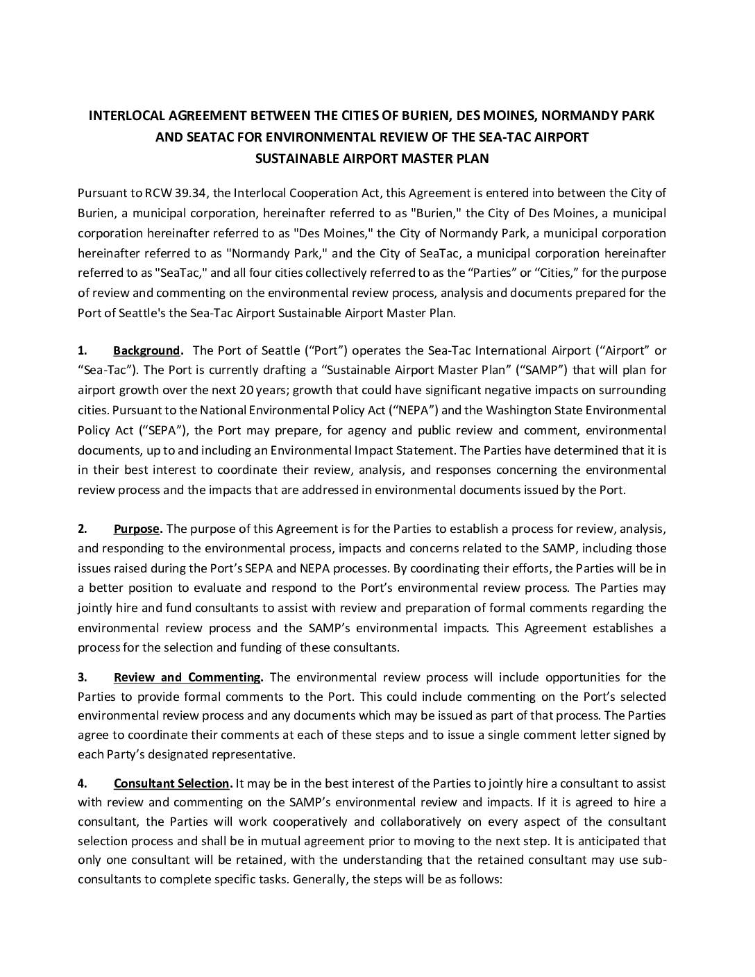Pursuant to RCW 39.34, the Interlocal Cooperation Act, this Agreement is entered into between the City of Burien, a municipal corporation, hereinafter referred to as "Burien," the City of Des Moines, a municipal corporation hereinafter referred to as "Des Moines," the City of Normandy Park, a municipal corporation hereinafter referred to as "Normandy Park," and the City of SeaTac, a municipal corporation hereinafter referred to as "SeaTac," and all four cities collectively referred to as the “Parties” or “Cities,” for the purpose of review and commenting on the environmental review process, analysis and documents prepared for the Port of Seattle's the Sea-Tac Airport Sustainable Airport Master Plan. 1. Background. The Port of Seattle (“Port”) operates the Sea-Tac International Airport (“Airport” or “Sea-Tac”). The Port is currently drafting a “Sustainable Airport Master Plan” (“SAMP”) that will plan for airport growth over the next 20 years; growth that could have significant negative impacts on surrounding cities. Pursuant to the National Environmental Policy Act (“NEPA”) and the Washington State Environmental Policy Act (“SEPA”), the Port may prepare, for agency and public review and comment, environmental documents, up to and including an Environmental Impact Statement. The Parties have determined that it is in their best interest to coordinate their review, analysis, and responses concerning the environmental review process and the impacts that are addressed in environmental documents issued by the Port. 2. Purpose. The purpose of this Agreement is for the Parties to establish a process for review, analysis, and responding to the environmental… -