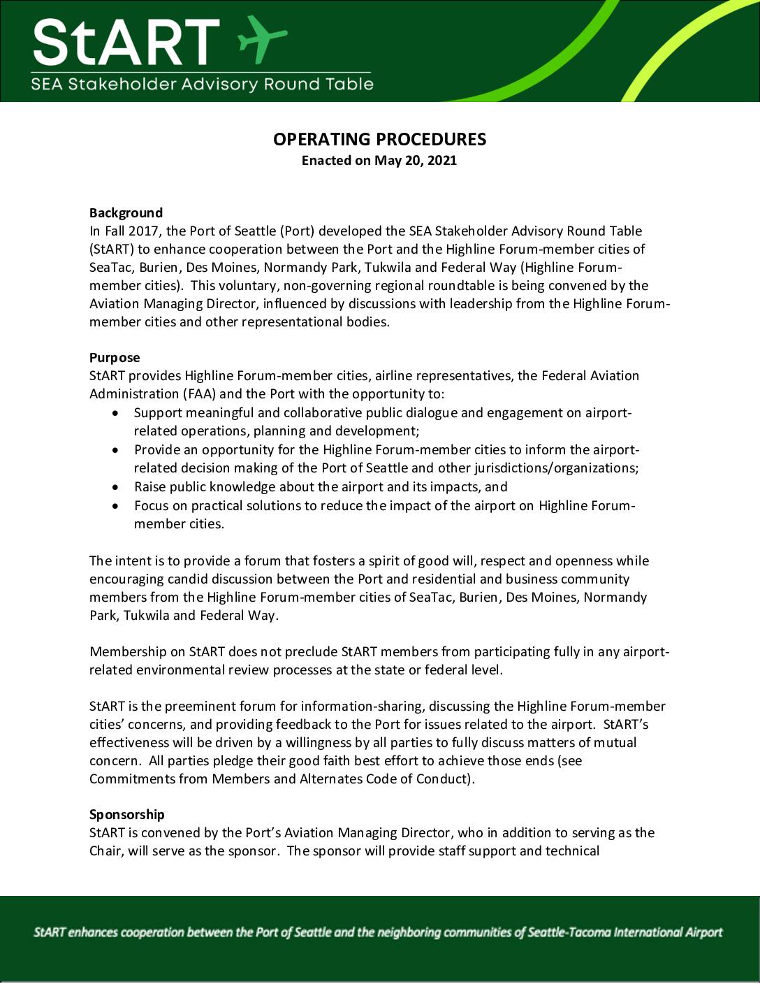 In Fall 2017, the Port of Seattle (Port) developed the SEA Stakeholder Advisory Round Table (StART) to enhance cooperation between the Port and the Highline Forum-member cities of SeaTac, Burien, Des Moines, Normandy Park, Tukwila and Federal Way (Highline Forum- member cities). This voluntary, non-governing regional roundtable is being convened by the Aviation Managing Director, influenced by discussions with leadership from the Highline Forum- member cities and other representational bodies. Purpose StART provides Highline Forum-member cities, airline representatives, the Federal Aviation Administration (FAA) and the Port with the opportunity to: • Support meaningful and collaborative public dialogue and engagement on airport- related operations, planning and development; • Provide an opportunity for the Highline Forum-member cities to inform the airport- related decision making of the Port of Seattle and other jurisdictions/organizations; • Raise public knowledge about the airport and its impacts, and • Focus on practical solutions to reduce the impact of the airport on Highline Forum- member cities. The intent is to provide a forum that fosters a spirit of good will, respect and openness while encouraging candid discussion between the Port and residential and business community members from the Highline Forum-member cities of SeaTac, Burien, Des Moines, Normandy Park, Tukwila and Federal Way. Membership on StART does not preclude StART members from participating fully in any airport- related environmental review processes at the state or federal level. StART is the preeminent forum for information-sharing, discussing the Highline Forum-member cities’ concerns, and providing feedback to the Port for issues related… -