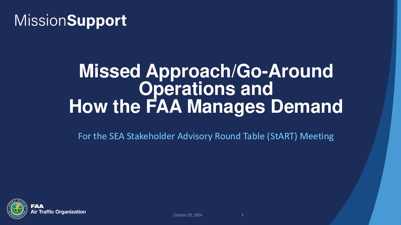 For the SEA Stakeholder Advisory Round Table (StART) Meeting October 22, 2024 2 Missed Approach • A missed approach procedure is followed if an approach cannot be continued to an airport. • Missed approach procedures are designed to protect aircraft from other aircraft, terrain, and obstacles on the ground. • Some reasons for executing a missed approach: • The pilot cannot transition to the visual portion of the approach (e.g., fog). • Wind and weather issues. • The approach and/or transition to the landing phase has become unstabilized. • The runway is not clear. • A landing clearance has not been received or is canceled by air traffic control (ATC). • The missed approach is being flown for training (pre-planned and approved by ATC). October 22, 2024 2 October 22, 2024 3 Go-Around • A go-around is a normal operation used when approach or landing parameters deviate from expectations or may be hazardous. • Go-arounds: • Can be initiated by the pilot or ATC when landing conditions are not satisfactory. • Are a routine safety maneuver that may also be used during emergency situations. • Are well practiced and known by pilots as an alternative to landing. • Factors that can lead to a go-around: • ATC initiated action due to overtaking another aircraft, prioritizing the handling of an aircraft in distress, or other issues. • Unexpected hazards on the runway, such as wildlife, debris, other aircraft, or vehicles. • Wind shear. • Wake turbulence from preceding aircraft. • Unstable…