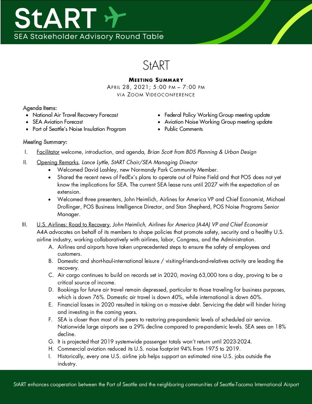 StART enhances cooperation between the Port of Seattle and the neighboring communities of Seattle-Tacoma International Airport StART MEETING SUMMARY APR I L 28, 2021; 5:00 PM – 7:00 PM VIA ZOOM V IDEOCONFERENCE Agenda Items: • National Air Travel Recovery Forecast • Federal Policy Working Group meeting update • SEA Aviation Forecast • Aviation Noise Working Group meeting update • Port of Seattle’s Noise Insulation Program • Public Comments Meeting Summary: I. Facilitator welcome, introduction, and agenda, Brian Scott from BDS Planning & Urban Design II. Opening Remarks, Lance Lyttle, StART Chair/SEA Managing Director • Welcomed David Lashley, new Normandy Park Community Member. • Shared the recent news of FedEx’s plans to operate out of Paine Field and that POS does not yet know the implications for SEA. The current SEA lease runs until 2027 with the expectation of an extension. • Welcomed three presenters, John Heimlich, Airlines for America VP and Chief Economist, Michael Drollinger, POS Business Intelligence Director, and Stan Shepherd, POS Noise Programs Senior Manager. III. U.S. Airlines: Road to Recovery, John Heimlich, Airlines for America (A4A) VP and Chief Economist A4A advocates on behalf of its members to shape policies that promote safety, security and a healthy U.S. airline industry, working collaboratively with airlines, labor, Congress, and the Administration. A. Airlines and airports have taken unprecedented steps to ensure the safety of employees and customers. B. Domestic and short-haul-international leisure / visiting-friends-and-relatives activity are leading the recovery. C. Air cargo continues to build on records set… -