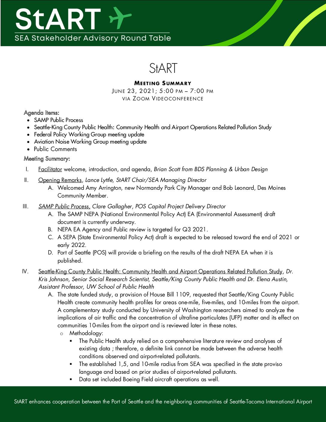 StART enhances cooperation between the Port of Seattle and the neighboring communities of Seattle-Tacoma International Airport StART MEETING SUMMARY JUNE 23, 2021; 5:00 PM – 7:00 PM VIA ZOOM V IDEOCONFERENCE Agenda Items: • SAMP Public Process • Seattle-King County Public Health: Community Health and Airport Operations Related Pollution Study • Federal Policy Working Group meeting update • Aviation Noise Working Group meeting update • Public Comments Meeting Summary: I. Facilitator welcome, introduction, and agenda, Brian Scott from BDS Planning & Urban Design II. Opening Remarks, Lance Lyttle, StART Chair/SEA Managing Director A. Welcomed Amy Arrington, new Normandy Park City Manager and Bob Leonard, Des Moines Community Member. III. SAMP Public Process, Clare Gallagher, POS Capital Project Delivery Director A. The SAMP NEPA (National Environmental Policy Act) EA (Environmental Assessment) draft document is currently underway. B. NEPA EA Agency and Public review is targeted for Q3 2021. C. A SEPA (State Environmental Policy Act) draft is expected to be released toward the end of 2021 or early 2022. D. Port of Seattle (POS) will provide a briefing on the results of the draft NEPA EA when it is published. IV. Seattle-King County Public Health: Community Health and Airport Operations Related Pollution Study, Dr. Kris Johnson, Senior Social Research Scientist, Seattle/King County Public Health and Dr. Elena Austin, Assistant Professor, UW School of Public Health A. The state funded study, a provision of House Bill 1109, requested that Seattle/King County Public Health create community health profiles for areas one-mile, five-miles, and… -