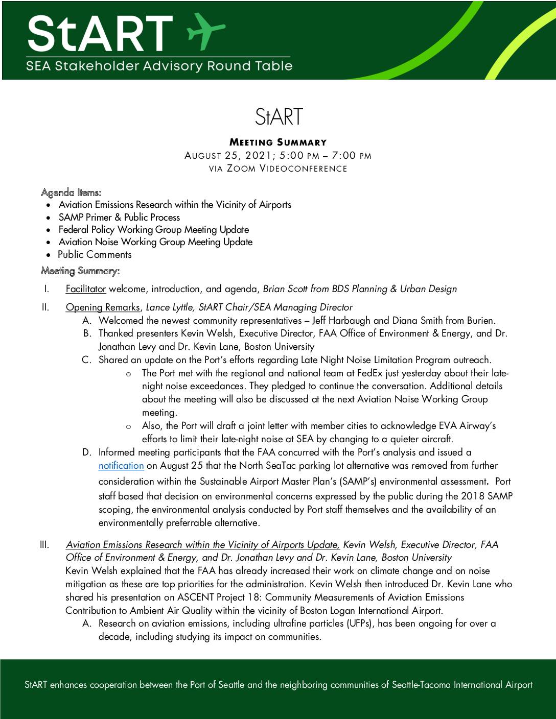 StART enhances cooperation between the Port of Seattle and the neighboring communities of Seattle-Tacoma International Airport StART MEETING SUMMARY AUGUST 25, 2021; 5:00 PM – 7:00 PM VIA ZOOM V IDEOCONFERENCE Agenda Items: • Aviation Emissions Research within the Vicinity of Airports • SAMP Primer & Public Process • Federal Policy Working Group Meeting Update • Aviation Noise Working Group Meeting Update • Public Comments Meeting Summary: I. Facilitator welcome, introduction, and agenda, Brian Scott from BDS Planning & Urban Design II. Opening Remarks, Lance Lyttle, StART Chair/SEA Managing Director A. Welcomed the newest community representatives – Jeff Harbaugh and Diana Smith from Burien. B. Thanked presenters Kevin Welsh, Executive Director, FAA Office of Environment & Energy, and Dr. Jonathan Levy and Dr. Kevin Lane, Boston University C. Shared an update on the Port’s efforts regarding Late Night Noise Limitation Program outreach. o The Port met with the regional and national team at FedEx just yesterday about their late- night noise exceedances. They pledged to continue the conversation. Additional details about the meeting will also be discussed at the next Aviation Noise Working Group meeting. o Also, the Port will draft a joint letter with member cities to acknowledge EVA Airway’s efforts to limit their late-night noise at SEA by changing to a quieter aircraft. D. Informed meeting participants that the FAA concurred with the Port’s analysis and issued a notification on August 25 that the North SeaTac parking lot alternative was removed from further consideration within the Sustainable Airport…