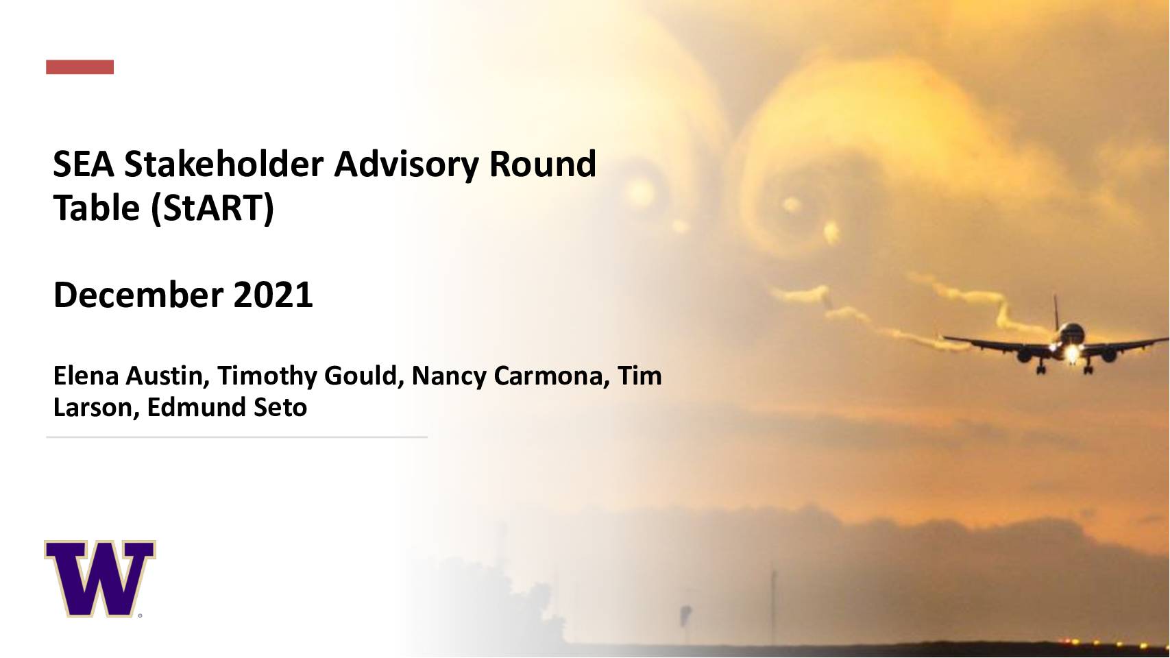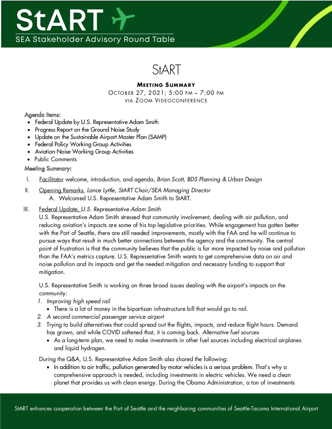StART enhances cooperation between the Port of Seattle and the neighboring communities of Seattle-Tacoma International Airport StART MEETING SUMMARY OCTOBER 27, 2021; 5:00 PM – 7:00 PM VIA ZOOM V IDEOCONFERENCE Agenda Items: • Federal Update by U.S. Representative Adam Smith • Progress Report on the Ground Noise Study • Update on the Sustainable Airport Master Plan (SAMP) • Federal Policy Working Group Activities • Aviation Noise Working Group Activities • Public Comments Meeting Summary: I. Facilitator welcome, introduction, and agenda, Brian Scott, BDS Planning & Urban Design II. Opening Remarks, Lance Lyttle, StART Chair/SEA Managing Director A. Welcomed U.S. Representative Adam Smith to StART. III. Federal Update, U.S. Representative Adam Smith U.S. Representative Adam Smith stressed that community involvement, dealing with air pollution, and reducing aviation’s impacts are some of his top legislative priorities. While engagement has gotten better with the Port of Seattle, there are still needed improvements, mostly with the FAA and he will continue to pursue ways that result in much better connections between the agency and the community. The central point of frustration is that the community believes that the public is far more impacted by noise and pollution than the FAA’s metrics capture. U.S. Representative Smith wants to get comprehensive data on air and noise pollution and its impacts and get the needed mitigation and necessary funding to support that mitigation. U.S. Representative Smith is working on three broad issues dealing with the airport’s impacts on the community: 1. Improving high speed rail •… -