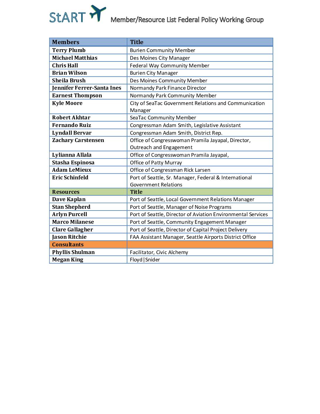 StART Member/Resource List Federal Policy Working Group Members Title Terry Plumb Burien Community Member Michael Matthias Des Moines City Manager Chris Hall Federal Way Community Member Brian Wilson Burien City Manager Sheila Brush Des Moines Community Member Jennifer Ferrer-Santa Ines Normandy Park Finance Director Earnest Thompson Normandy Park Community Member Kyle Moore City of SeaTac Government Relations and Communication Manager Robert Akhtar SeaTac Community Member Fernando Ruiz Congressman Adam Smith, Legislative Assistant Lyndall Bervar Congressman Adam Smith, District Rep. Zachary Carstensen Office of Congresswoman Pramila Jayapal, Director, Outreach and Engagement Lylianna Allala Office of Congresswoman Pramila Jayapal, Stasha Espinosa Office of Patty Murray Adam LeMieux Office of Congressman Rick Larsen Eric Schinfeld Port of Seattle, Sr. Manager, Federal & International Government Relations Resources Title Dave Kaplan Port of Seattle, Local Government Relations Manager Stan Shepherd Port of Seattle, Manager of Noise Programs Arlyn Purcell Port of Seattle, Director of Aviation Environmental Services Marco Milanese Port of Seattle, Community Engagement Manager Clare Gallagher Port of Seattle, Director of Capital Project Delivery Jason Ritchie FAA Assistant Manager, Seattle Airports District Office Consultants Phyllis Shulman Facilitator, Civic Alchemy Megan King Floyd|Snider -