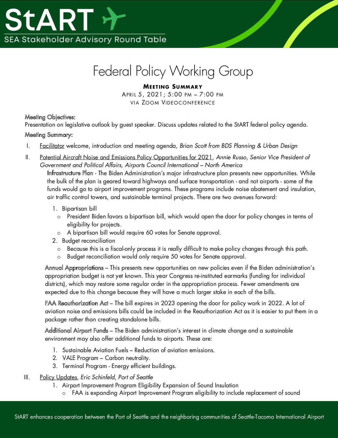 StART enhances cooperation between the Port of Seattle and the neighboring communities of Seattle-Tacoma International Airport Federal Policy Working Group MEETING SUMMARY APR I L 5, 2021; 5:00 PM – 7:00 PM VIA ZOOM V IDEOCONFERENCE Meeting Objectives: Presentation on legislative outlook by guest speaker. Discuss updates related to the StART federal policy agenda. Meeting Summary: I. Facilitator welcome, introduction and meeting agenda, Brian Scott from BDS Planning & Urban Design II. Potential Aircraft Noise and Emissions Policy Opportunities for 2021, Annie Russo, Senior Vice President of Government and Political Affairs, Airports Council International – North America Infrastructure Plan - The Biden Administration’s major infrastructure plan presents new opportunities. While the bulk of the plan is geared toward highways and surface transportation - and not airports - some of the funds would go to airport improvement programs. These programs include noise abatement and insulation, air traffic control towers, and sustainable terminal projects. There are two avenues forward: 1. Bipartisan bill o President Biden favors a bipartisan bill, which would open the door for policy changes in terms of eligibility for projects. o A bipartisan bill would require 60 votes for Senate approval. 2. Budget reconciliation o Because this is a fiscal-only process it is really difficult to make policy changes through this path. o Budget reconciliation would only require 50 votes for Senate approval. Annual Appropriations – This presents new opportunities on new policies even if the Biden administration’s appropriation budget is not yet known. This year Congress re-instituted earmarks…
