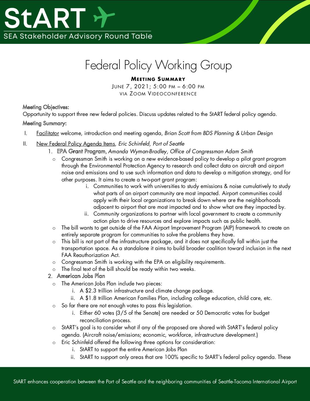 StART enhances cooperation between the Port of Seattle and the neighboring communities of Seattle-Tacoma International Airport Federal Policy Working Group MEETING SUMMARY JUNE 7, 2021; 5:00 PM – 6:00 PM VIA ZOOM V IDEOCONFERENCE Meeting Objectives: Opportunity to support three new federal policies. Discuss updates related to the StART federal policy agenda. Meeting Summary: I. Facilitator welcome, introduction and meeting agenda, Brian Scott from BDS Planning & Urban Design II. New Federal Policy Agenda Items, Eric Schinfeld, Port of Seattle 1. EPA Grant Program, Amanda Wyman-Bradley, Office of Congressman Adam Smith o Congressman Smith is working on a new evidence-based policy to develop a pilot grant program through the Environmental Protection Agency to research and collect data on aircraft and airport noise and emissions and to use such information and data to develop a mitigation strategy, and for other purposes. It aims to create a two-part grant program: i. Communities to work with universities to study emissions & noise cumulatively to study what parts of an airport community are most impacted. Airport communities could apply with their local organizations to break down where are the neighborhoods adjacent to airport that are most impacted and to show what are they impacted by. ii. Community organizations to partner with local government to create a community action plan to drive resources and explore impacts such as public health. o The bill wants to get outside of the FAA Airport Improvement Program (AIP) framework to create an entirely separate program for communities to solve… -