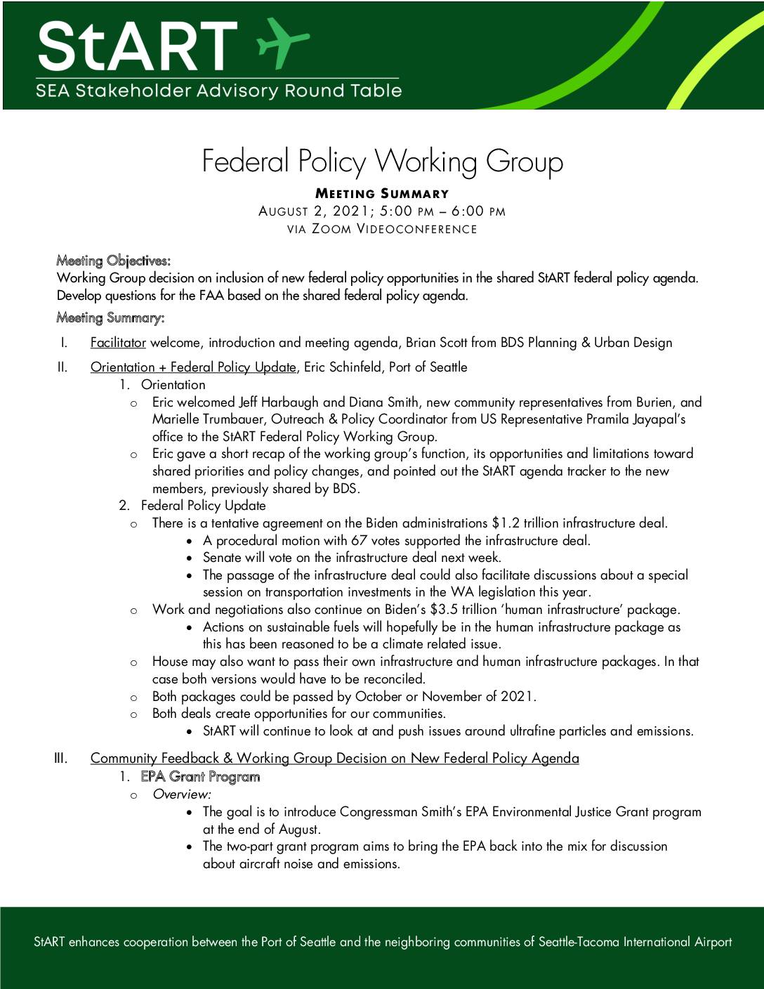 StART enhances cooperation between the Port of Seattle and the neighboring communities of Seattle-Tacoma International Airport Federal Policy Working Group MEETING SUMMARY AUGUST 2, 2021; 5:00 PM – 6:00 PM VIA ZOOM V IDEOCONFERENCE Meeting Objectives: Working Group decision on inclusion of new federal policy opportunities in the shared StART federal policy agenda. Develop questions for the FAA based on the shared federal policy agenda. Meeting Summary: I. Facilitator welcome, introduction and meeting agenda, Brian Scott from BDS Planning & Urban Design II. Orientation + Federal Policy Update, Eric Schinfeld, Port of Seattle 1. Orientation o Eric welcomed Jeff Harbaugh and Diana Smith, new community representatives from Burien, and Marielle Trumbauer, Outreach & Policy Coordinator from US Representative Pramila Jayapal’s office to the StART Federal Policy Working Group. o Eric gave a short recap of the working group’s function, its opportunities and limitations toward shared priorities and policy changes, and pointed out the StART agenda tracker to the new members, previously shared by BDS. 2. Federal Policy Update o There is a tentative agreement on the Biden administrations $1.2 trillion infrastructure deal. • A procedural motion with 67 votes supported the infrastructure deal. • Senate will vote on the infrastructure deal next week. • The passage of the infrastructure deal could also facilitate discussions about a special session on transportation investments in the WA legislation this year. o Work and negotiations also continue on Biden’s $3.5 trillion ‘human infrastructure’ package. • Actions on sustainable fuels will hopefully be in the… -
