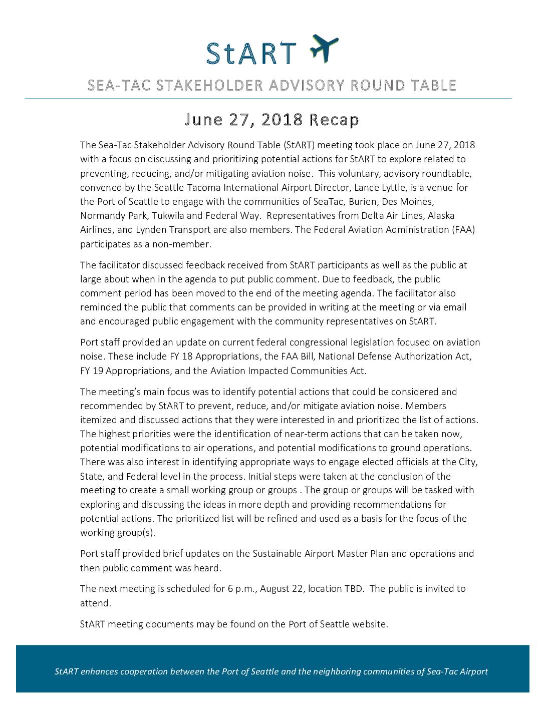 StART enhances cooperation between the Port of Seattle and the neighboring communities of Sea-Tac Airport June 27, 2018 Recap The Sea-Tac Stakeholder Advisory Round Table (StART) meeting took place on June 27, 2018 with a focus on discussing and prioritizing potential actions for StART to explore related to preventing, reducing, and/or mitigating aviation noise. This voluntary, advisory roundtable, convened by the Seattle-Tacoma International Airport Director, Lance Lyttle, is a venue for the Port of Seattle to engage with the communities of SeaTac, Burien, Des Moines, Normandy Park, Tukwila and Federal Way. Representatives from Delta Air Lines, Alaska Airlines, and Lynden Transport are also members. The Federal Aviation Administration (FAA) participates as a non-member. The facilitator discussed feedback received from StART participants as well as the public at large about when in the agenda to put public comment. Due to feedback, the public comment period has been moved to the end of the meeting agenda. The facilitator also reminded the public that comments can be provided in writing at the meeting or via email and encouraged public engagement with the community representatives on StART. Port staff provided an update on current federal congressional legislation focused on aviation noise. These include FY 18 Appropriations, the FAA Bill, National Defense Authorization Act, FY 19 Appropriations, and the Aviation Impacted Communities Act. The meeting’s main focus was to identify potential actions that could be considered and recommended by StART to prevent, reduce, and/or mitigate aviation noise. Members itemized and discussed actions that they were… -