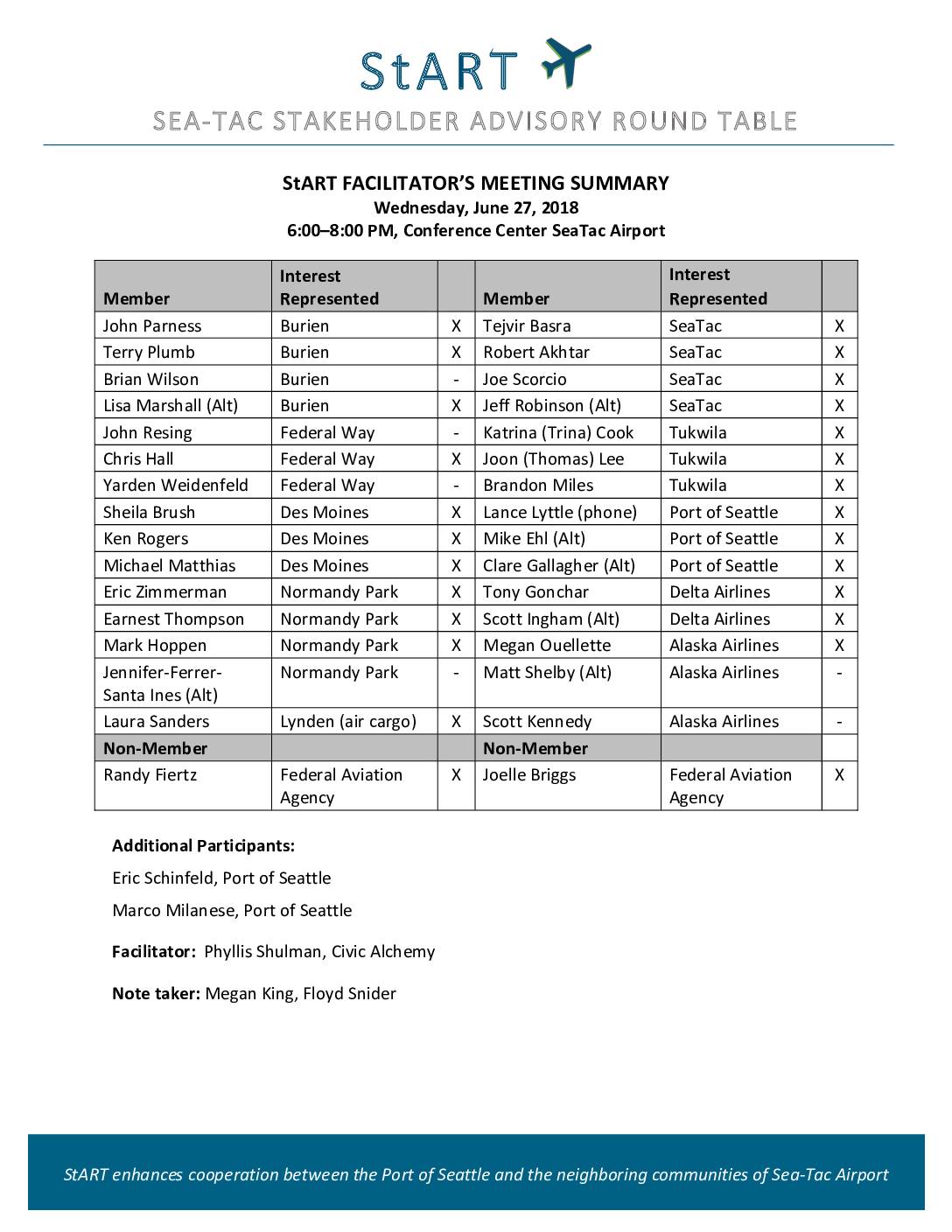 StART enhances cooperation between the Port of Seattle and the neighboring communities of Sea-Tac Airport StART FACILITATOR’S MEETING SUMMARY Wednesday, June 27, 2018 6:00–8:00 PM, Conference Center SeaTac Airport Member Interest Represented Member Interest Represented John Parness Burien X Tejvir Basra SeaTac X Terry Plumb Burien X Robert Akhtar SeaTac X Brian Wilson Burien - Joe Scorcio SeaTac X Lisa Marshall (Alt) Burien X Jeff Robinson (Alt) SeaTac X John Resing Federal Way - Katrina (Trina) Cook Tukwila X Chris Hall Federal Way X Joon (Thomas) Lee Tukwila X Yarden Weidenfeld Federal Way - Brandon Miles Tukwila X Sheila Brush Des Moines X Lance Lyttle (phone) Port of Seattle X Ken Rogers Des Moines X Mike Ehl (Alt) Port of Seattle X Michael Matthias Des Moines X Clare Gallagher (Alt) Port of Seattle X Eric Zimmerman Normandy Park X Tony Gonchar Delta Airlines X Earnest Thompson Normandy Park X Scott Ingham (Alt) Delta Airlines X Mark Hoppen Normandy Park X Megan Ouellette Alaska Airlines X Jennifer-Ferrer- Santa Ines (Alt) Normandy Park - Matt Shelby (Alt) Alaska Airlines - Laura Sanders Lynden (air cargo) X Scott Kennedy Alaska Airlines - Non-Member Non-Member Randy Fiertz Federal Aviation Agency X Joelle Briggs Federal Aviation Agency X Additional Participants: Eric Schinfeld, Port of Seattle Marco Milanese, Port of Seattle Facilitator: Phyllis Shulman, Civic Alchemy Note taker: Megan King, Floyd Snider Final StART Facilitator’s Meeting Summary June 27, 2018 Page 2 Meeting Objectives: To discuss and prioritize a list of potential actions for StART to… -