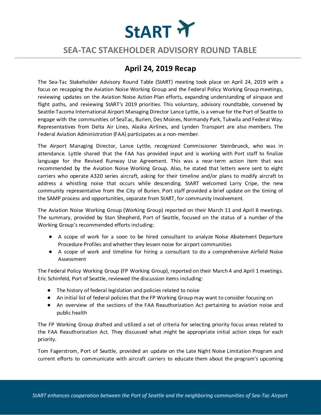 The Sea-Tac Stakeholder Advisory Round Table (StART) meeting took place on April 24, 2019 with a focus on recapping the Aviation Noise Working Group and the Federal Policy Working Group meetings, reviewing updates on the Aviation Noise Action Plan efforts, expanding understanding of airspace and flight paths, and reviewing StART’s 2019 priorities. This voluntary, advisory roundtable, convened by Seattle-Tacoma International Airport Managing Director Lance Lyttle, is a venue for the Port of Seattle to engage with the communities of SeaTac, Burien, Des Moines, Normandy Park, Tukwila and Federal Way. Representatives from Delta Air Lines, Alaska Airlines, and Lynden Transport are also members. The Federal Aviation Administration (FAA) participates as a non-member. The Airport Managing Director, Lance Lyttle, recognized Commissioner Steinbrueck, who was in attendance. Lyttle shared that the FAA has provided input and is working with Port staff to finalize language for the Revised Runway Use Agreement. This was a near-term action item that was recommended by the Aviation Noise Working Group. Also, he stated that letters were sent to eight carriers who operate A320 series aircraft, asking for their timeline and/or plans to modify aircraft to address a whistling noise that occurs while descending. StART welcomed Larry Cripe, the new community representative from the City of Burien. Port staff provided a brief update on the timing of the SAMP process and opportunities, separate from StART, for community involvement. The Aviation Noise Working Group (Working Group) reported on their March 11 and April 8 meetings. The summary, provided by Stan… -