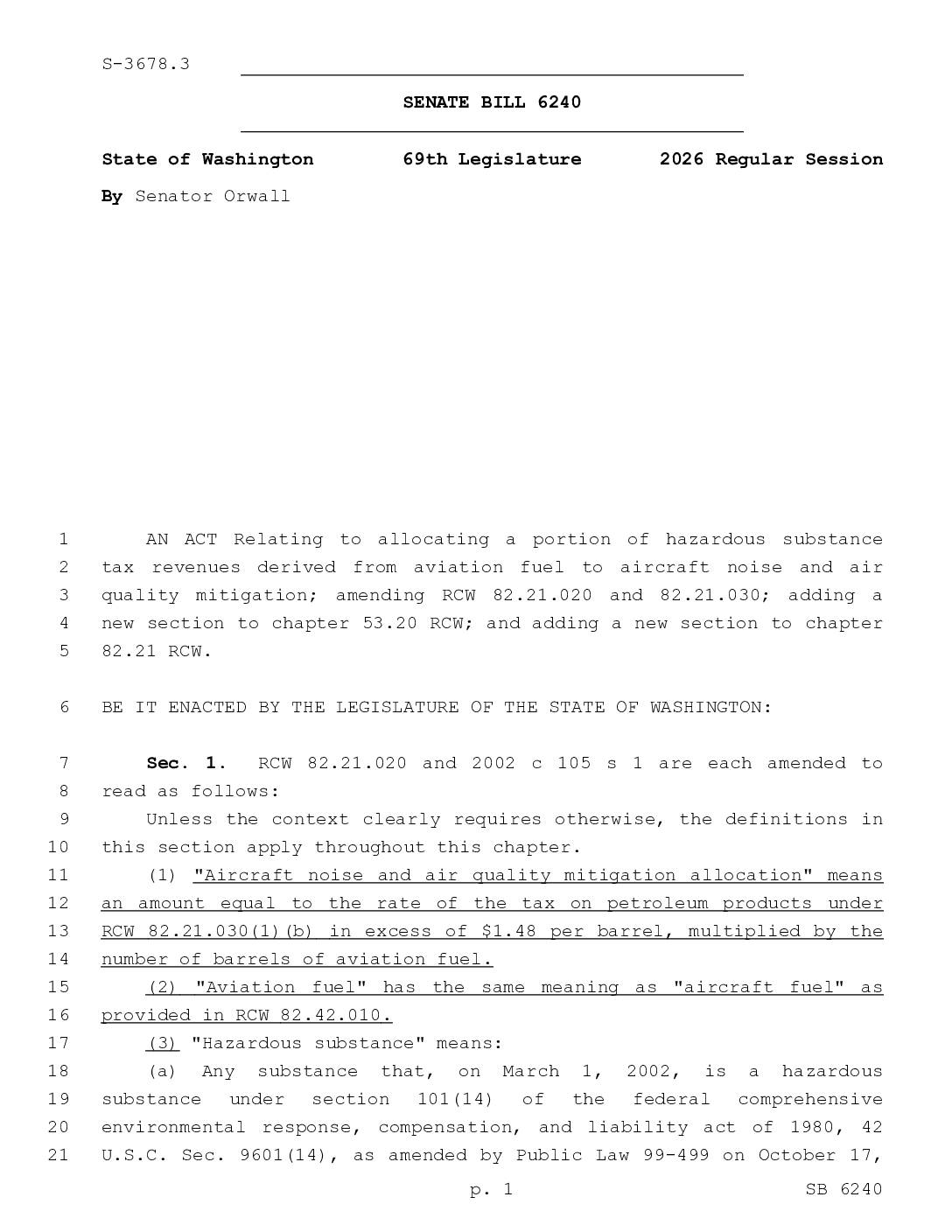 Washington State Senate Bill 6240 introduced by Senator Orwall in the 2026 legislative session. The bill proposes to allocate a portion of hazardous substance tax revenues derived from aviation fuel to aircraft noise and air quality mitigation programs in a new, dedicated state account with funds available to the RCW53 aviation-impacted area. It is estimated