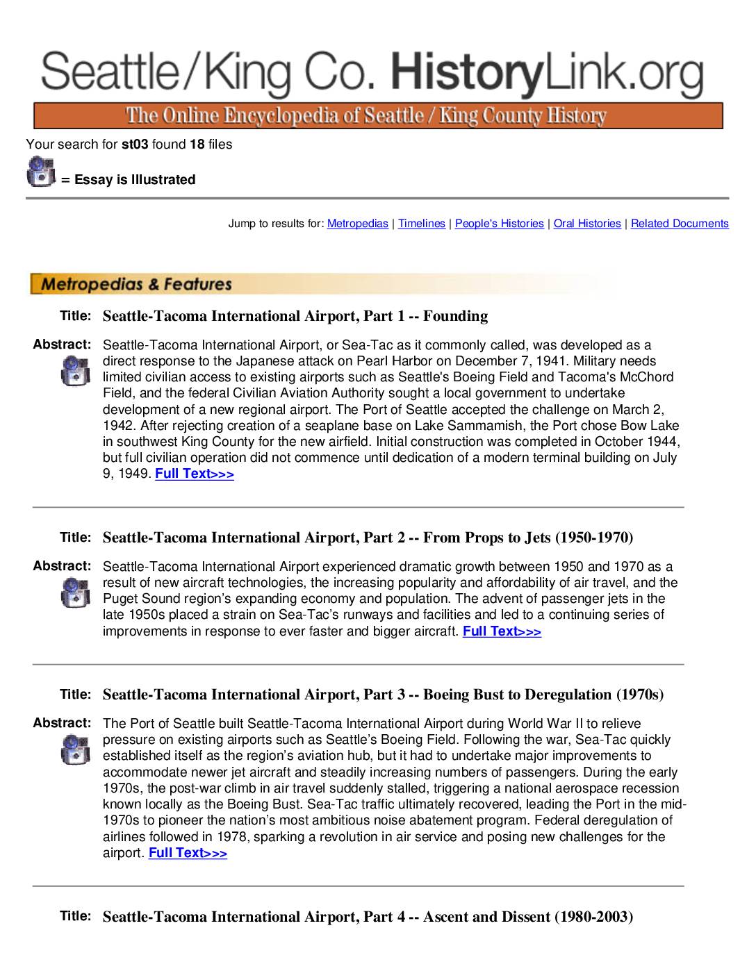 Your search for st03 found 18 files = Essay is Illustrated Jump to results for: Metropedias | Timelines | People's Histories | Oral Histories | Related Documents Title: Seattle-Tacoma International Airport, Part 1 -- Founding Abstract: Seattle-Tacoma International Airport, or Sea-Tac as it commonly called, was developed as a direct response to the Japanese attack on Pearl Harbor on December 7, 1941. Military needs limited civilian access to existing airports such as Seattle's Boeing Field and Tacoma's McChord Field, and the federal Civilian Aviation Authority sought a local government to undertake development of a new regional airport. The Port of Seattle accepted the challenge on March 2, 1942. After rejecting creation of a seaplane base on Lake Sammamish, the Port chose Bow Lake in southwest King County for the new airfield. Initial construction was completed in October 1944, but full civilian operation did not commence until dedication of a modern terminal building on July 9, 1949. Full Text>>> Title: Seattle-Tacoma International Airport, Part 2 -- From Props to Jets (1950-1970) Abstract: Seattle-Tacoma International Airport experienced dramatic growth between 1950 and 1970 as a result of new aircraft technologies, the increasing popularity and affordability of air travel, and the Puget Sound region’s expanding economy and population. The advent of passenger jets in the late 1950s placed a strain on Sea-Tac’s runways and facilities and led to a continuing series of improvements in response to ever faster and bigger aircraft. Full Text>>> Title: Seattle-Tacoma International Airport, Part 3 -- Boeing Bust to…