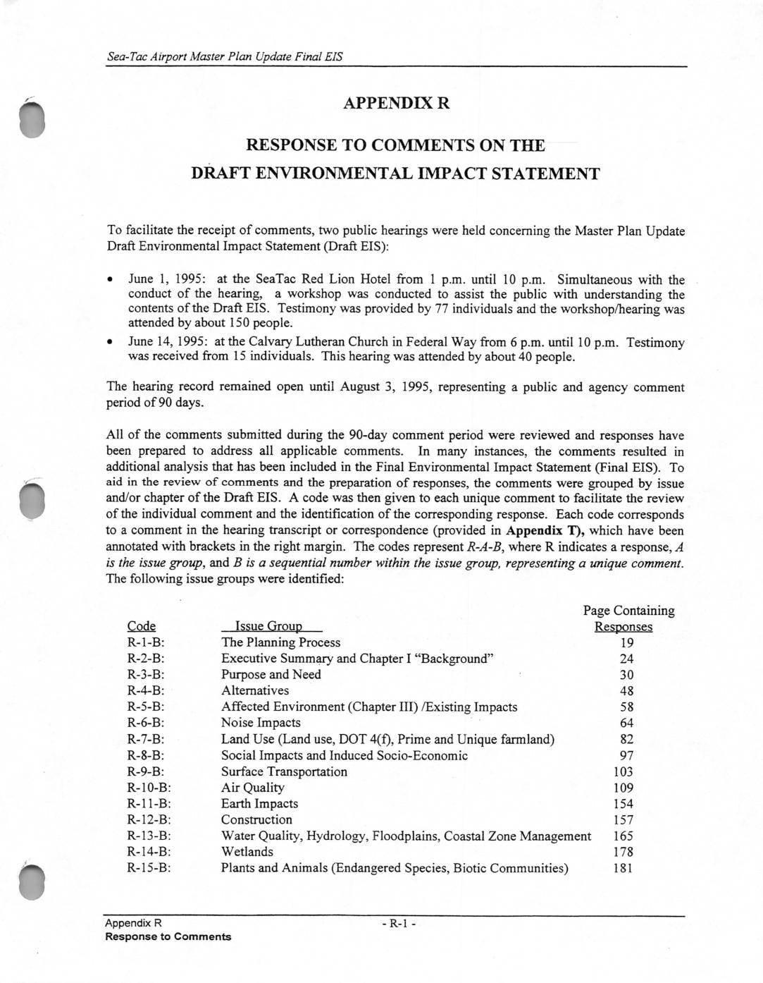 Sea-Tac Airport Master Plan Update Final EIS APPENDIX R RESPONSE TO COMMENTS ON THE DRAFT ENVIRONMENTAL IMPACT STATEMENT To facilitate the receipt of comments, two public hearings were held concerning the Master Plan Update Draft Environmental Impact Statement (Draft EIS): • June 1, 1995: at the SeaTac Red Lion Hotel from 1 p.m. until 10 p.m. Simultaleous with the conduct of the hearing, a workshop was conducted to assist the public widr urderstanding the contents of the Draft EIS. Testimony was provided by 77 individuals urd dre workshop/hearing was attended by about 150 people. June 14, 1995: at the Calvary Lutheran Church in Federal Way from 6 p.m. urtil IO p.m. Testimony was received 6:om 15 individuals. This hearing was attended by about 40 people. • The hearing record remained open until August 3, 1995, representing a public and agency comment period of 90 days. All of the comments submitted during the 90-day comment period were reviewed mId responses have been prepared to address all applicable comments. In many instances, the comments resulted in additional analysis that has been included in the Final Environmental Impact Statement (Final EIS). To aid in the review of comlnents and the preparation of responses, the comments were grouped by issue and/or chapter of the Draft EIS. A code was then given to each unique comment to facilitate the review of the individual comment and the identification of the corresponding response. Each code corresponds to a comment in the hearing transcript or correspondence (provided in…