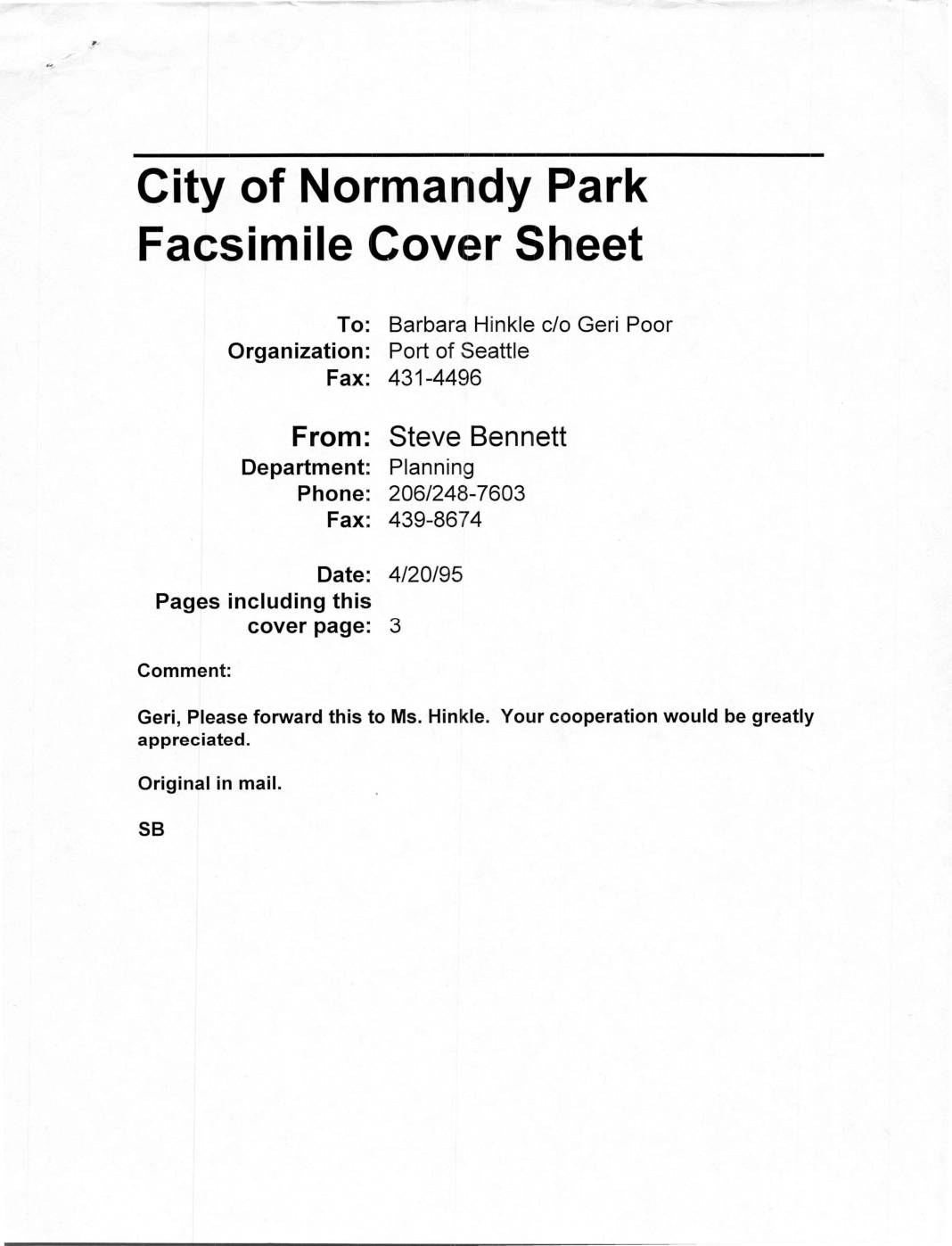 Geri, Please forward this to Ms. Hinkle. Your cooperation would be greatly appreciated. Original in mail. B SB of Normandy Park /+ • fIIING: April 20, 1995 Barbara Hinkle Port of Seattle Health, Safety & Environmental Manager P.O. Box 1209 Seattle, WA 98111 RE: DEIS - Sea-Tac International Airport Hotel Dear Ms. Hinkle: We appreciate the opportunity to comment on Draft Environmental Impact Statement for the proposed Sea-Tac International Airport Hotel. On behalf of the City of Normandy Park, I would like to take this opportunity to raise concerns about the need for this hotel facility and the effect it will have on airport services provided by the Port of Seattle to the residents of Normandy Park and the rest of King County who pay taxes to support it. The proposed facility may “promote the comfort and accommodation” of non-resident air travelers but it will only provide additional inconvenience and delay for the resident, tax-paying air travelers who must negotiate the traffic added by this hotel to the already congested enplane and deplane drives and who will have to search for already scarce parking spaces after existing parking capacity is carved out to accommodate hotel and conference related-vehicles . The writers of this DEIS have shown very little for regard for the City of SeaTac and its land use authority on non-essential airport facilities and no sense of responsibility to mitigate the parking impacts of this proposed facility. The proposal is to add 15 new parking spaces to serve 384… -