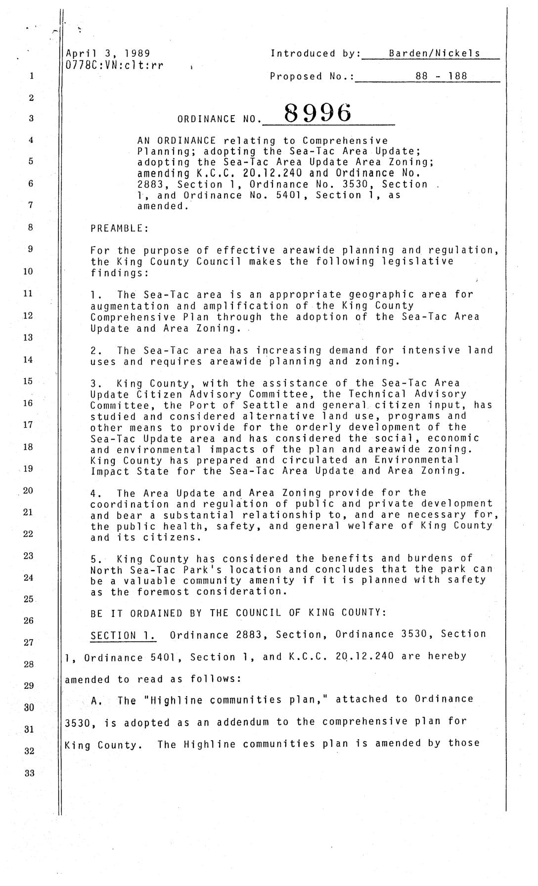 adopting the Sea-Tac Area Update Area Zoning; amending K.C.C. 20.12.240 and Ordinance No. 2883, Section 1, Ordinance No. 3530, Section 1, and Ordinance No. 5401, Section 1, as amended. PREAMBLE: For the purpose of effective areawide planning and regulation, the King County Council makes the following legislative findings: 1. The Sea-Tac area is an appropriate geographic area for augmentation and amplification of the King County Comprehensive Plan through the adoption of the Sea-Tac Area Update and Area Zoning. ' 2. The Sea-Tac area has increasing demand for intensive land uses and requires areawide 'planning and zoning. 3. King County, with the assistance of the Sea-Tac Area Update Citizen Advisory Committee, the Technical Advisory Committee, the Port of Seattle and general citizen input, has studied and considered alternative land use, programs and other means to provide for the orderly development of the Sea-Tac Update area and has considered the social, economic and environmental impacts of the plan and areawide zoning. King County has prepared and circulated an Environmental Impact State for the Sea-Tac Area Update and Area Zoning. 4. The Area Update and Area Zoning provide for the coordination and regulition of public and private development and bear a substantial relationship to, and are necessary for, the public health, safety, and general welfare of King County and its citizens. 5. King County has considered the benefits and burdens of North Sea-Tac Park's location and concludes that the park can be a valuable community amenity if it is planned with safety as…