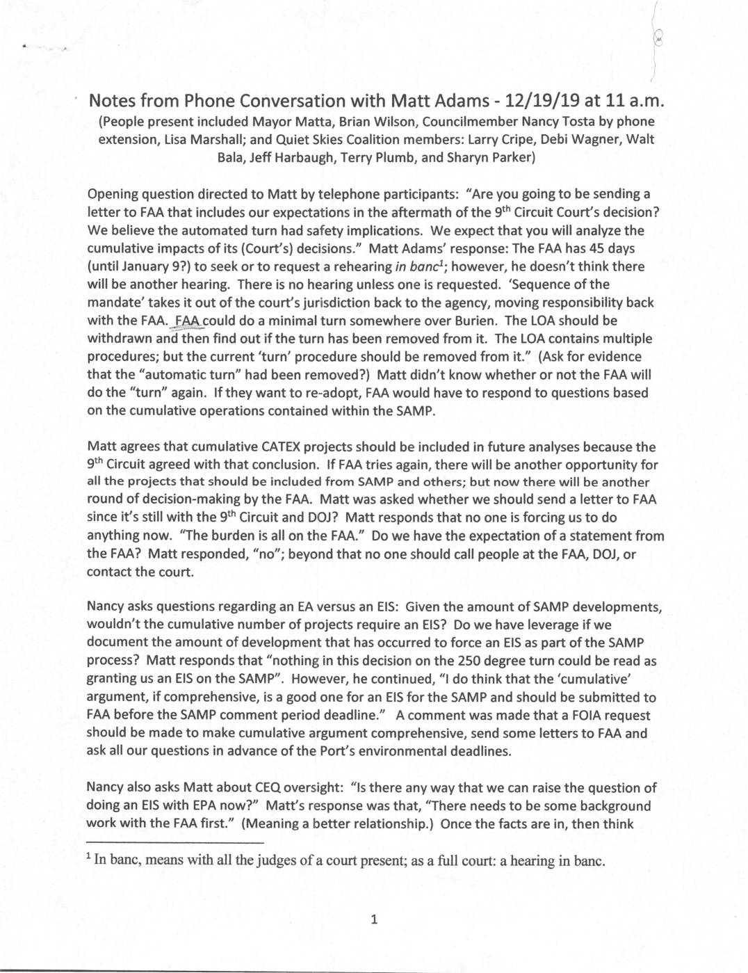 Notes from Phone Conversation with Matt Adams - 12/19/19 at 11 a.m. (People present included Mayor Matta, Brian Wilson, Councilmember Nancy Tosta by phone extension, Lisa Marshall; and Quiet Skies Coalition members: Larry Cripe, Debi Wagner, WaIt Bala, Jeff Harbaugh, Terry Plumb, and Sharyn Parker) Opening question directed to Matt by telephone participants: “Are you going to be sending a letter to FAA that includes our expectations in the aftermath of the 9th Circuit Court’s decision? We believe the automated turn had safety implications. We expect that you will analyze the cumulative impacts of its (Court’s) decisions." Matt Adams’ response: The FAA has 45 days (until January 9?) to seek or to request a rehearing in banc:1) however, he doesn’t think there will be another hearing. There is no hearing unless one is requested. 'Sequence of the mandate’ takes it out of the court’s jurisdiction back to the agency, moving responsibility back with the FAA. FAAcould do a minimal turn somewhere over Burien. The LOA should be +’nBwwW withdrawn and then find out if the turn has been removed from it. The LOA contains multiple procedures; but the current 'turn’ procedure should be removed from it." (Ask for evidence that the “automatic turn" had been removed?) Matt didn’t know whether or not the FAA will do the “turn" again. If they want to re-adopt, FAA would have to respond to questions based on the cumulative operations contained within the SAMP. Matt agrees that cumulative CATEX projects should be included in…