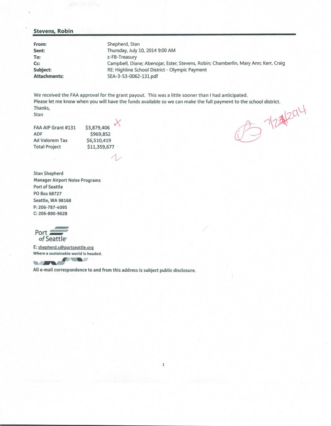 Campbell, Diane; Abenojar, Estec Stevens, Robin; Chamberlin, Mary Ann; Kerr, Craig RE: Highiine School District - Olympic Payment SEA-3-53-0062-131.pdf We received the FAA approval for the grant payout. This was a littie sooner than i had anticipated. Please let me know when you will have the funds available so we can make the full payment to the school district. Thanks, Stan $3,879,406 §969,852 $6,510,419 $11,359,677 X FAA AIP Grant #:131 ADF Ad Va lorem Tax Total Project , Stan Shepherd Manager Airport Noise Programs Port of Seattle PO Box 68727 Seattle, WA 98 t68 P: 206-787-4095 C: 206-890-9628 n=uP POrt Www of Seattle ./' E: shePherd.s@portseattle.org Where a sustainable world is headed. % n@if we All e-mail correspondence to and from this address is subject public djsclosure. e FeD ICC' ]- e) zvc)t 66 US OepaRmerit of TanspQaat tan Federal Aviation Administration Seattle Airports District Office 1601 Una Avenue. S.W., Suite 250 Renton. Washington 98057-3356 July 9. 2014 Ms. Ester Aberldar Program Budget Manager Pod of Seattle PO Box 68727 Seatt ie, WA Airport: Seattie-Tacoma International Airport Location: Seattle, Washington AIP Project Number: 3-53-0062-131-2013 Contract Number: DOT.FA13NM-75 Finat Payment Notification Description: Noise mitigation for Olympic Elementary school; Dear Ms. Aber!<)jar. Your final project closeout documentation has been reviewed and determined to be satisfactory. You may now seek reimbursernent for your final payment of $3.879,406.00. Please review the following grant summary. if your records identify any discrepancy, please notify us immediately. OriQina! Grant Amount :ait–+ I e’- tIll.; =ir; , g…