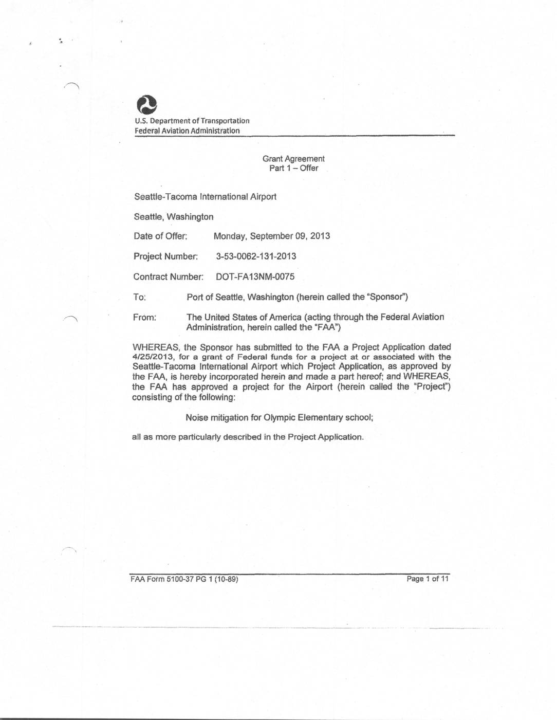 Date of Offer: Monday. Septernber 09, 2013 Project Nurnbec 3-53-0062-131-2013 Contract Number: DOT-FA13NM-0075 To: From: Port of Seattle, Washington (herein called the "Sponsor”) 'n The United States ofArnerica (acting through the Federal Aviation Administration, herein called the “FAA”) WHEREAS, the Sponsor has subrnitted to the FAA a Project Application dated 4/25/2013, for a grant of Federal funds for a project at or associated with the Seattle-Tacoma International Airport which Project Application, as approved by the FAA, is hereby incorporated herein and made a part hereof; and WHEREAS, the FAA has approved a project for the Airport (herein called the “Project”) consisting of the following: Noise mitigation for Olympic Elementary school; all as more particularly described in the Project Application. FAA Form 5100-37 PG 1 (10-89) Page 1 of 11 • ,n NOW THEREFORE, pursuant to and for the purpose of carrying out the provisions of Title 49, United States Code, and in consideration of (a) the Sponsor’s adoption and ratifIcation of the representations and assurances contained in said Project Application and its acceptance of this Offer as hereinafter provided, and (b) the benefits to accrue to the United States and the public front the accomplishment of the Project and compliance with the assurances and conditions as herein provided, THE FEDERAL AVIATION ADMINISTRATION, FOR AND ON BEMALF OF THC UNITED STATES. HEREBY OFFERS AND AGREES to pay, as the United States share of the allowable costs incurred in dcconlplishing the Project, 80.00 percent:um of all allowable Project costs. This Offer is… -