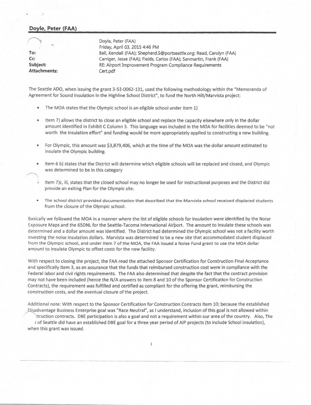 Ball, Kendall (FAA); Shepherd.S@portseaH Ie.org; Read, Carolyn (FAA) Carriger, Jesse (FAA); Fields, Carlos (FAA); Sanmanin, Frank (FAA) RE: Airport Improvement Program Compliance Requirernents Cert.pdf +1 IB () : ( C : Subject: Attachments: The Seattle ADO, when issuing the grant 3-53-0062-131, used the following methodology within the “Memoranda of Agreement for Sound Insulation in the Highline School District", to fund the North Hill/Mawista project: e The MOA states that the Olympic school is an eligible school under Item 1) ' Item 7) allows the district to close an eligible school and replace the capacity elsewhere only in the dollar amount identified in Exhibit C Column 3. This language was included in the MOA for facilities deemed to be "not worth the insulation effort" and funding would be more appropriately applied to constructing a new building. ' For Olympic, this amount was $3,879,406, which at the time of the MOA was the dollar amount estimated to insulate the Olympic building. e /-X, Item 6 b) states that the District will determine which eligible schools will be replaced and closed, and Olympic was determined to be in this category J Item 7)c, iii, states that the closed school may no longer be used for instructional purposes and the District did provide an exiting Plan for the Olympic site. ' The school district provided documentation that described that the Mawista school received displaced students from the closure of the Olympic school. Basically we followed the MOA in a manner where the list of… -