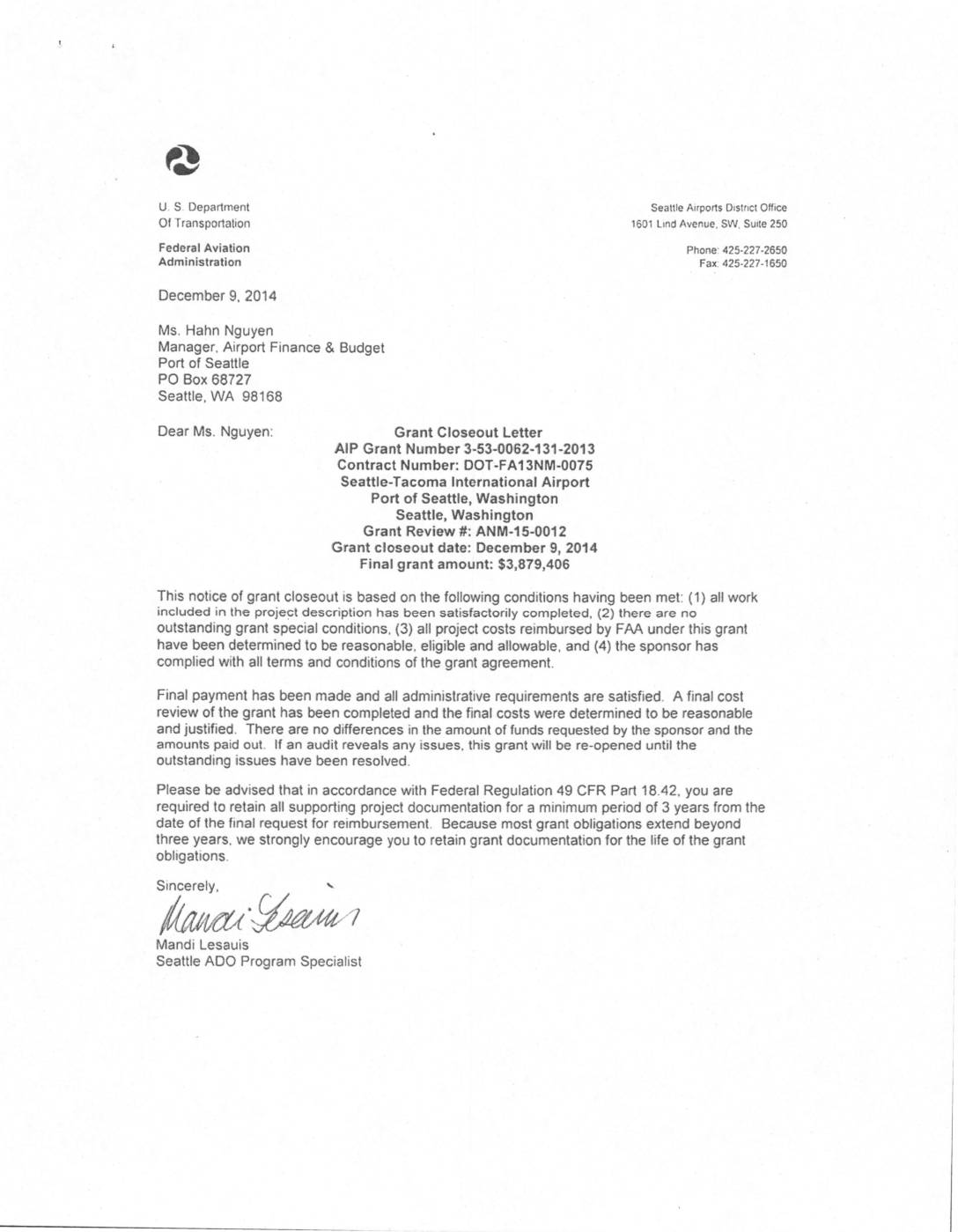 This notice of grant ctoseout is based on the following conditions having been met: (1) all work included in the proje9t description has been satisfactorily completed, (2) there are no outstanding grant speciai conditions. (3) all project costs reimbursed by FM under this grant have been determined to be reasonable. eligible and allowable, and {4) the sponsor has complied with all terms and conditions of the grant agreement. Fina! payment has been made and all administrative requirements are satisfied. Anna: cost review of the grant has been completed and the final costs were determined to be reasonable and justified. There are no differences in the amount of funds requested by the sponsor and the arnounts paid out. if an audit reveals any issues. this grant will be re-opened until the outstanding issues have been resolved. Please be advised that in accordance with Federal Regulation 49 CFR Part 18.42. you are required to retain all supporting project documentation for a minimum period of 3 years from the date of the final request for reimbursement. Because most grant obligations extend beyond three years, we strongty encourage you to retain grant documentation for the life of the grant obligations. SIncerely , Mandi Lesauis Seattle ADO Program Specialist e €3 U.S. Department of TranspoRaUon Federal Aviation Administration Grant Agreement Part 1 – Offer Seattle-Tacoma International Airport Seattle, Washington Date of Offer: Monday, September 09, 2013 3-53-0062-131-2013Project Nurnber: Contract Number: DOT-FA13NM-0075 To: Port of Seattle. Washington (herein called the -Sponsor”) The United States of America… -