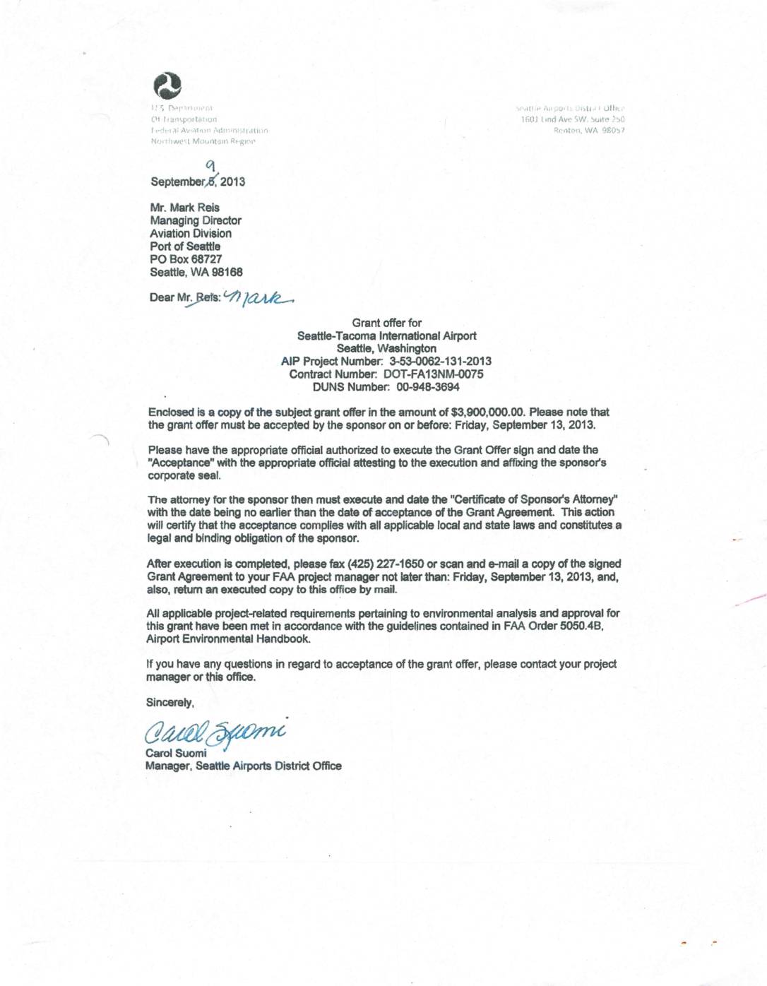 t rae’la: AvId tII ill At$!!;iII iSIId{ii:a !go F'T 1I west Mol.J Atall Rt'gtoi’ I'f;fIt! :I' Ajl DO' t :- iI;iiII .i i IJttll. ,- } SOI tIna Aye SW, >,UIl-e ;hCI QI::l1181 1. bVA 98057 q Septemtnr,g201 3 Mr. Mark Reis Managing Director Aviation Division Port of Seattle PO Box 68727 Seattle, WA 98168 Dear Mpa: '7) 1 Grant aMr for $e3ttleTacoma International Airport SeatHe, Washington AIP Pojnt NumtHr &534062-131'2C)13 Contract Number DOT-FA13NM-tX>75 DUNS Number 00-948.3694 Enclosed k a copy of the subject grant offer in tIn amount of $3, WaX).00. Please note that the grant oSor must be acoepted by the sponsor on or before: Friday, September 13, 2013. • -b Please have the appropriate official authorized to execute the Grant Offer sign and date the "Aaeptanc8" with the appropriate offkial attesting to the execution and affixing the $pon80r'$ corporate seal. The attorney for the sponsor then must ex@ute and date tIn "Cat#icat9 of Sponsor’s Attorney" with the date being no earlier than the date of a@eptanoe of the Grant Agreement This action will certify that the aa®pt8nc8 cornplies with all applicable local and state laws and constitutes a legal and bInding obIIgation of the sponsor. A6er execution is completed, please hx (425) 227-1650 or scan and email a copy of the signed Grant Agreernent to yalr FAA prqecR manager not later than: Friday, Septenlber '13, 2013, and, also, ©tum an executed copy to this aBiDe by mdf. All applicable project+elated requirements pertaining to environmental analysis and approval… -