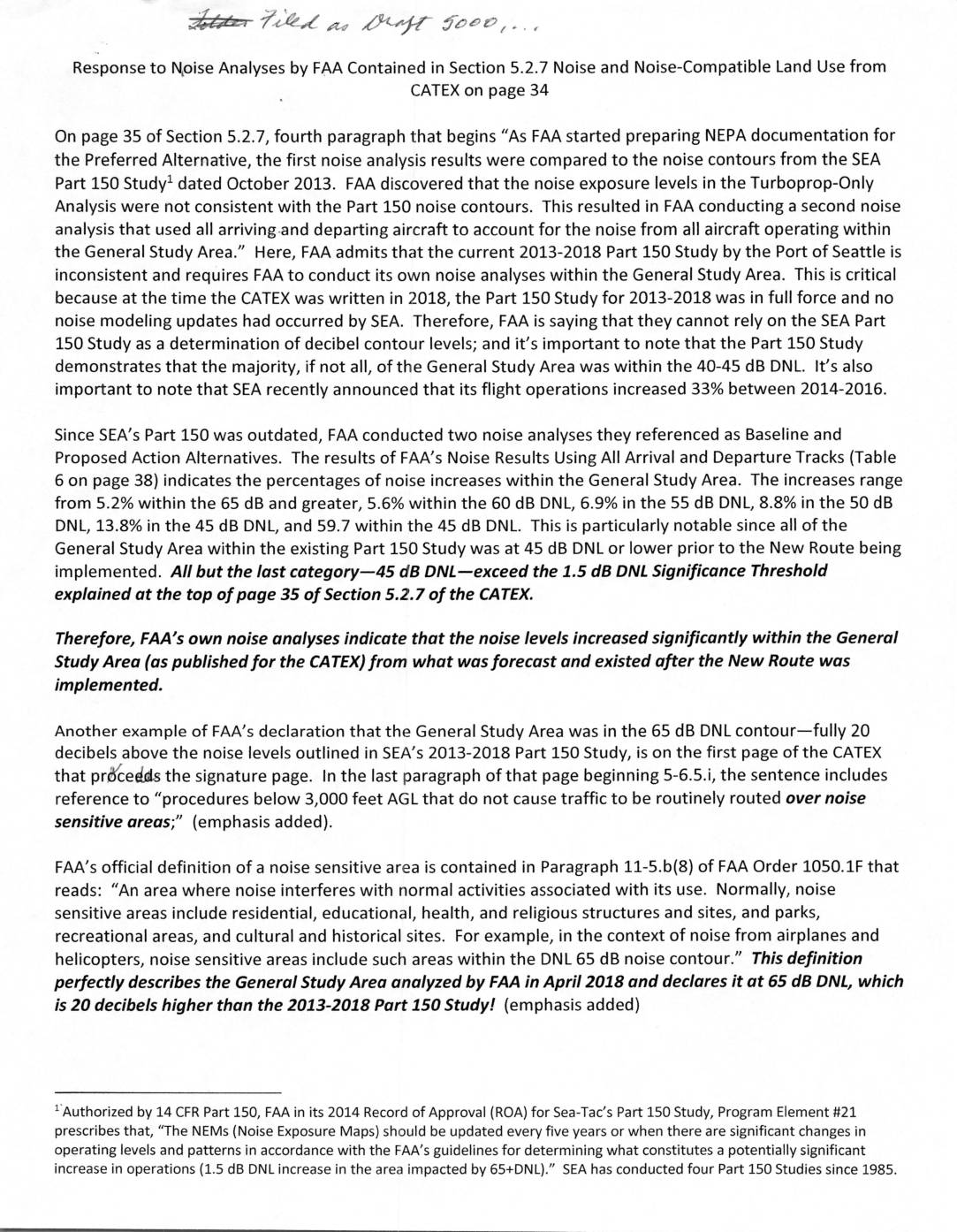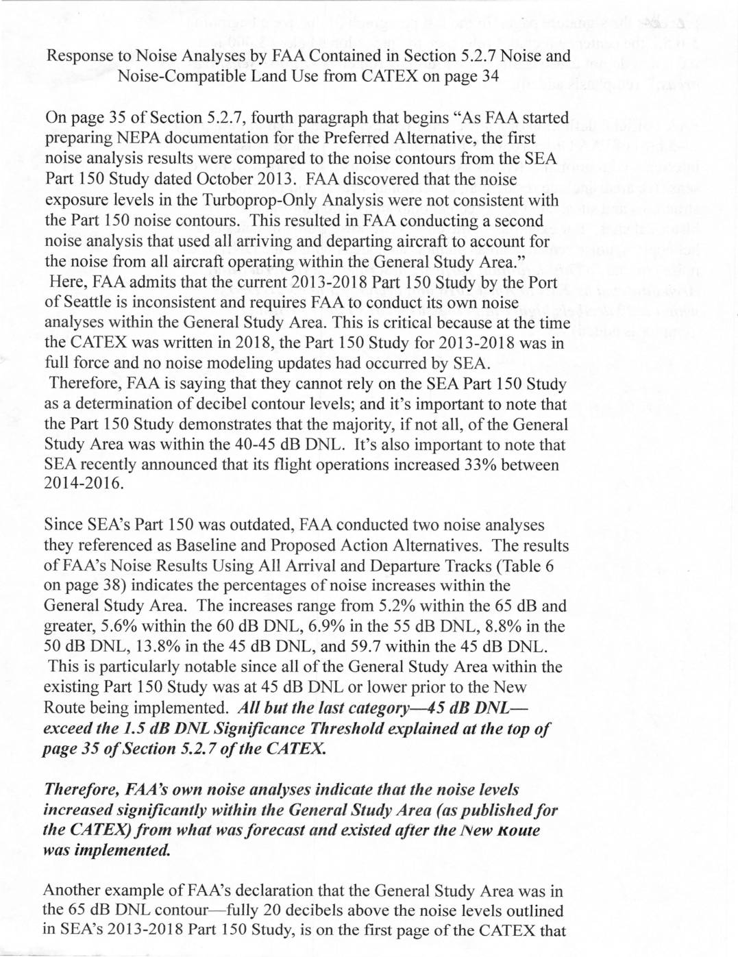 af/-d ?in A, A47 Jooo , , . , Response to Noise Analyses by FAA Contained in Section 5.2.7 Noise and Noise-Compatible Land Use from CATEX on page 34 On page 35 of Section 5.2.7, fourth paragraph that begins “As FAA started preparing NEPA documentation for the Preferred Alternative, the first noise analysis results were compared to the noise contours from the SEA Part 150 Study1 dated October 2013. FAA discovered that the noise exposure levels in the Turboprop-Only Analysis were not consistent with the Part 150 noise contours. This resulted in FAA conducting a second noise analysis that used all arriving.and departing aircraft to account for the noise from all aircraft operating within the General Study Area.” Here, FAA admits that the current 2013-2018 Part 150 Study by the Port of Seattle is inconsistent and requires FAA to conduct its own noise analyses within the General Study Area. This is critical because at the time the CATEX was written in 2018, the Part 150 Study for 2013-2018 was in full force and no noise modeling updates had occurred by SEA. Therefore, FAA is saying that they cannot rely on the SEA Part 150 Study as a determination of decibel contour levels; and it’s important to note that the Part 150 Study demonstrates that the majority, if not all, of the General Study Area was within the 40-45 dB DNL. It’s also important to note that SEA recently announced that its flight operations increased 33% between 2014-2016. Since SEA’s Part… -