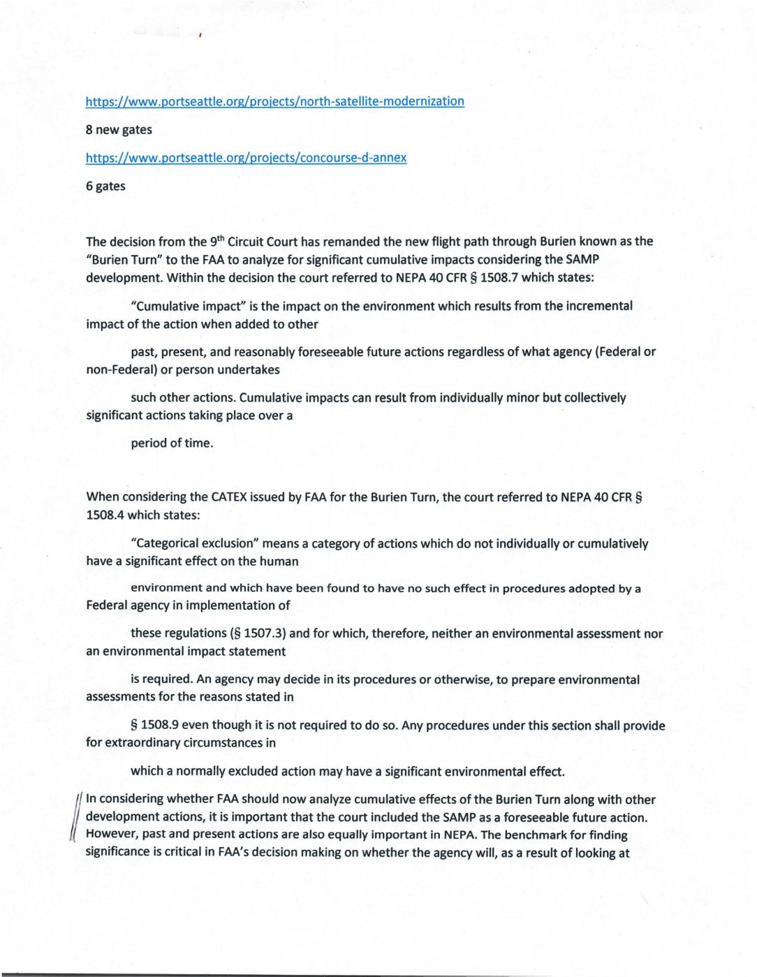 Tbe decision from the 9th Circuit Court has remanded the new flight path through Burien known as the “Burien Turn” to the FAA to analyze for significant cumulative impacts considering the SAMP development. Within the decision the court referred to NEPA 40 CFR § 1508.7 which states: “Cumulative impact” is the impact on the environment which results from the incremental impact of the action when added to other past, present, and reasonably foreseeable future actions regardless of what agency (Federal or non-Federal) or person undertakes such other actions. Cumulative impacts can result from individually minor but collectively significant actions taking place over a period of time. When considering the CATEX issued by FAA for the Burien Turn, the court referred to NEPA 40 CFR § 1508.4 which states: “Categorical exclusion” means a category of actions which do not individually or cumulatively have a significant effect on the human environment and which have been found to have no such effect in procedures adopted by a Federal agency in implementation of these regulations (§ 1507.3) and for which, therefore, neither an environmental assessment nor an environmental impact statement is required. An agency may decide in its procedures or otherwise, to prepare environmental assessments for the reasons stated in § 1508.9 even though it is not required to do so. Any procedures under this section shall provide for extraordinary circumstances in which a normally excluded action may have a significant environmental effect. In considering whether FAA should now analyze cumulative effects of the… -