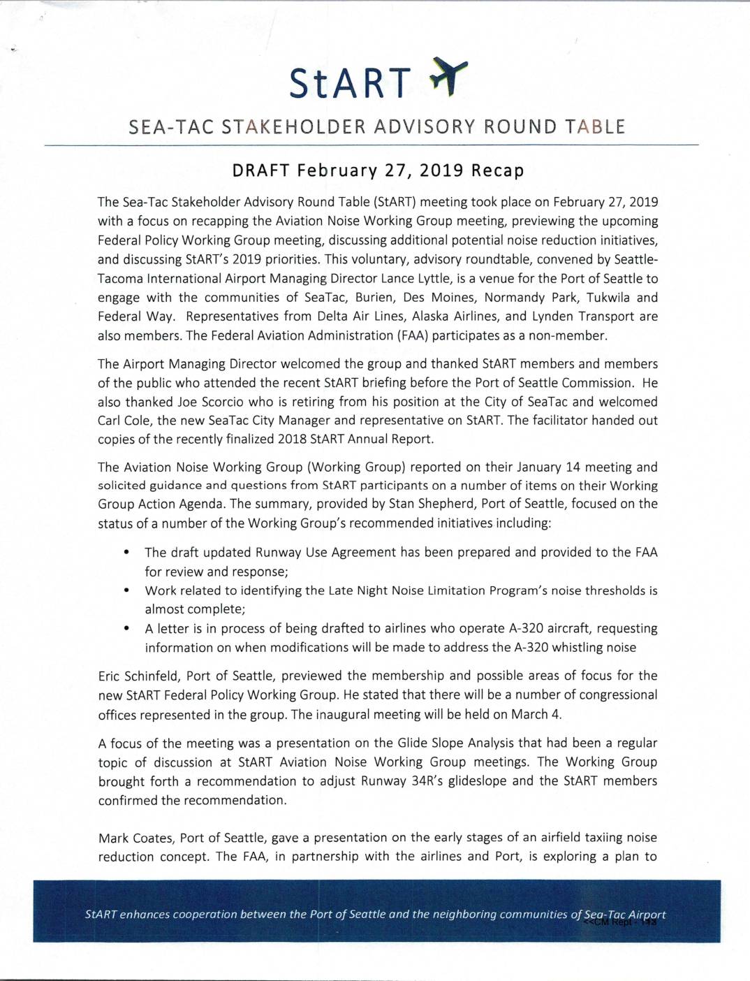 The Sea-Tac Stakeholder Advisory Round Table (StART) meeting took place on February 27, 2019 with a focus on recapping the Aviation Noise Working Group meeting, previewing the upcoming Federal Policy Working Group meeting, discussing additional potential noise reduction initiatives, and discussing StART’s 2019 priorities. This voluntary, advisory roundtable, convened by Seattle- Tacoma International Airport Managing Director Lance Lyttle, is a venue for the Port of Seattle to engage with the communities of SeaTac, Burien, Des Moines, Normandy Park, Tukwila and Federal Way. Representatives from Delta Air Lines, Alaska Airlines, and Lynden Transport are also members. The Federal Aviation Administration (FAA) participates as a non-member. The Airport Managing Director welcomed the group and thanked StART members and members of the public who attended the recent StART briefing before the Port of Seattle Commission. He also thanked Joe Scorcio who is retiring from his position at the City of SeaTac and welcomed Carl Cole, the new SeaTac City Manager and representative on StART. The facilitator handed out copies of the recently finalized 2018 StART Annual Report. The Aviation Noise Working Group (Working Group) reported on their January 14 meeting and solicited guidance and questions from StART participants on a number of items on their Working Group Action Agenda. The summary, provided by Stan Shepherd, Port of Seattle, focused on the status of a number of the Working Group’s recommended initiatives including: • • • The draft updated Runway Use Agreement has been prepared and provided to the FAA for review and response;…